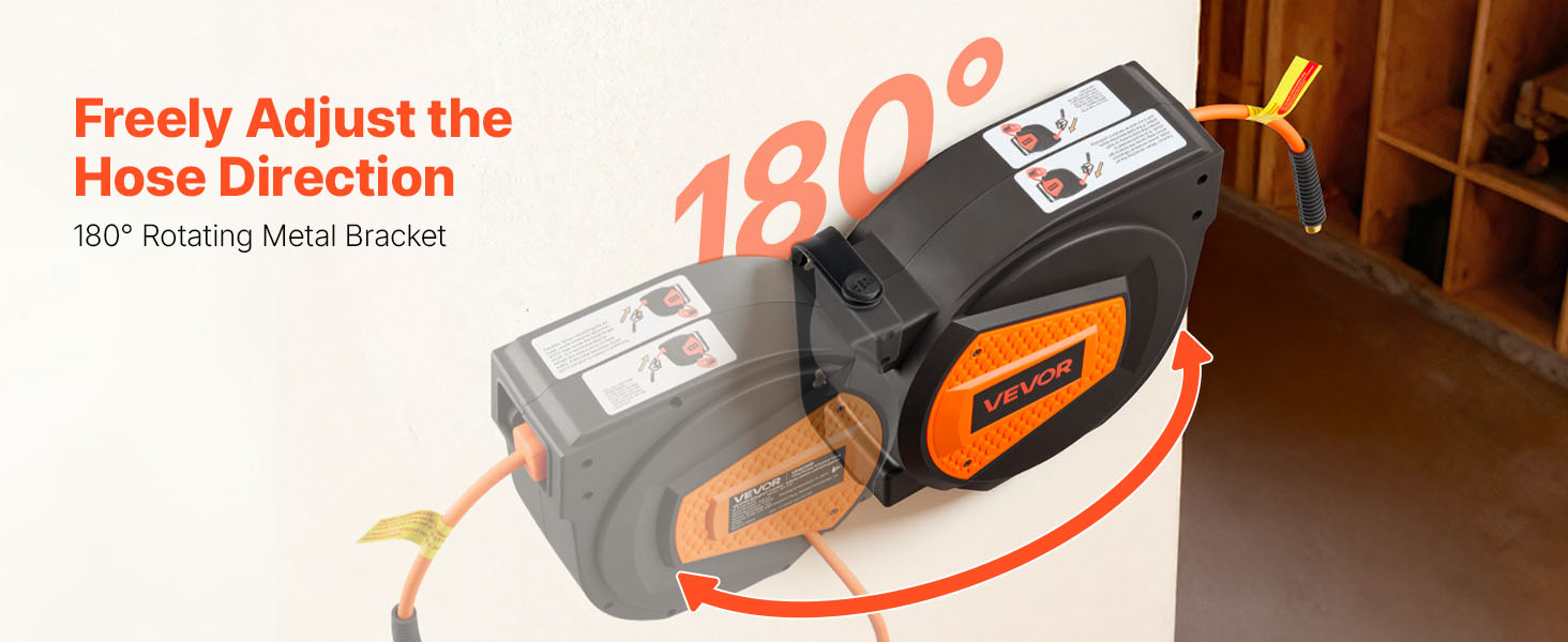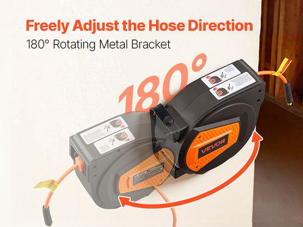 - 180° Swivel Bracket: Our air compressor hose reel comes with a pre-installed 180° swivel bracket for enhanced flexibility across multiple orientations. It is designed for mounting on ceilings, walls, or floors, ensuring the hose remains accessible and ready for use without kinking.