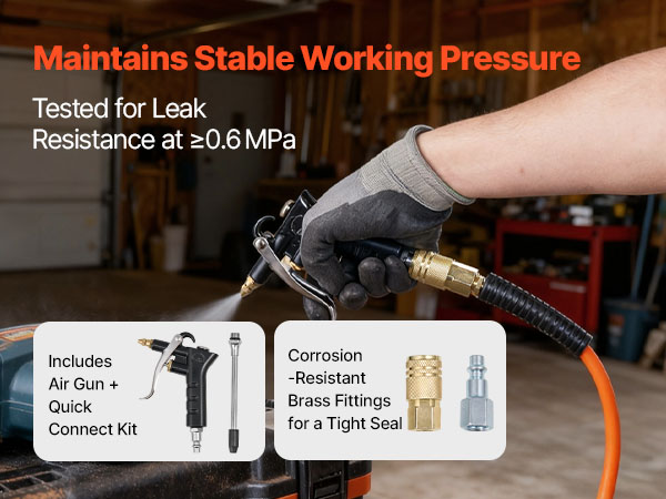 - Easy to Connect & Multi-Purpose: Our air hose has passed leak-proof testing, easily connecting to your air tools and compressor via the 1/4" NPT brass fitting and included quick-connector set. An air blow gun is also provided, making it ideal for auto repair shops, workshops, and garages.