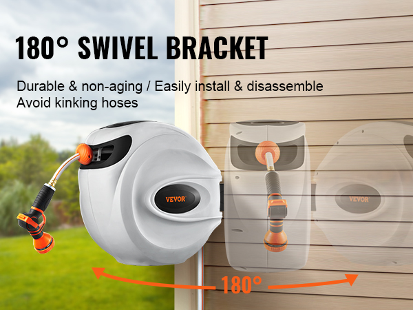 - Wall-mount & 180° Coverage: Our retractable water hose reel features a 180° plastic bracket, flexible enough for multi-directional watering. You can use the installation kit to quickly fix it to brick, concrete, wood, and stone surfaces. And it is also easy to remove and store in freeze-proof places. Mount where you want and spray how you like.