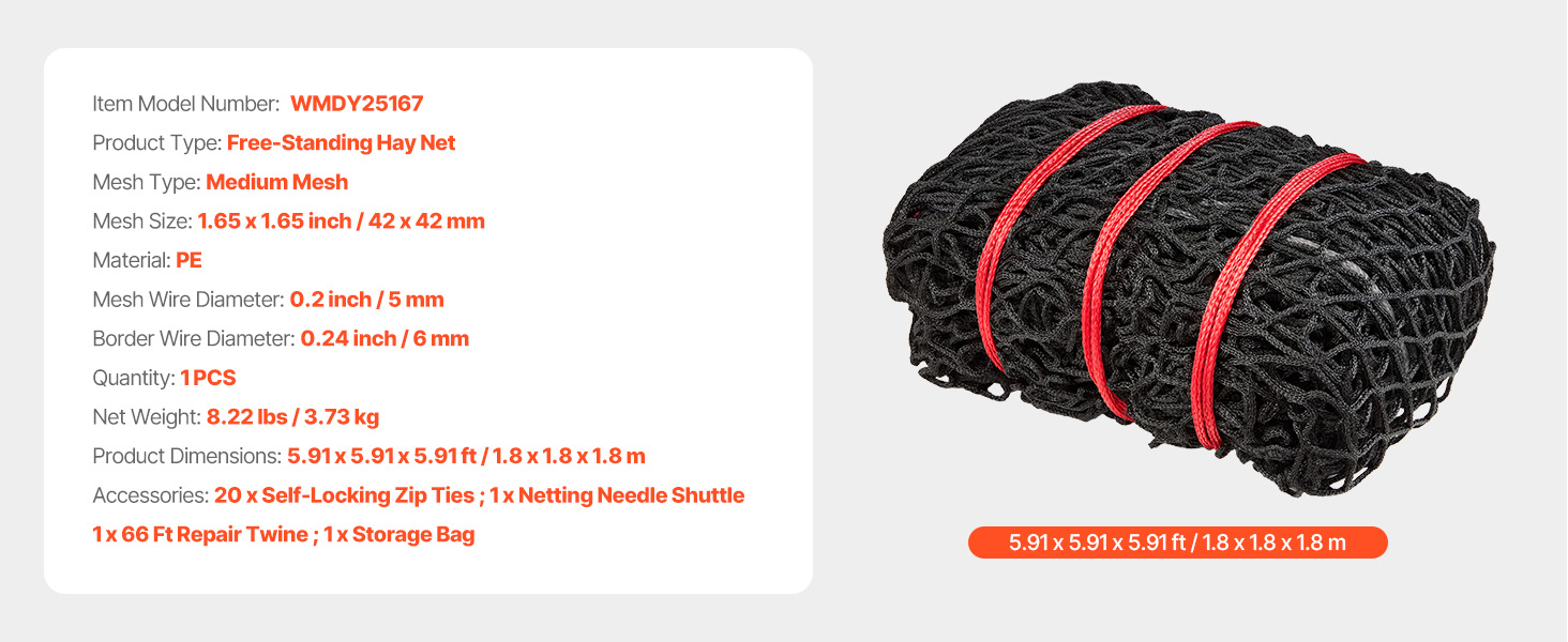 - Large Capacity: Measuring 5.91 x 5.91 x 5.91 ft, this round bale hay net holds 1800-2200 lbs of hay, including alfalfa and timothy bales. Wide opening allows easy filling, and adjustable straps secure the feed, ensuring efficient feeding for livestock.
