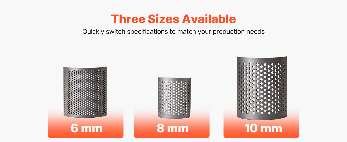 Our wear-resistant shredder screen provides three apertures (6 mm, 8 mm, 10 mm) to meet different crushing needs. The 6 mm option is ideal for micro crushing, the 8 mm for small particles crushing, and the 10mm for medium particle crushing.
