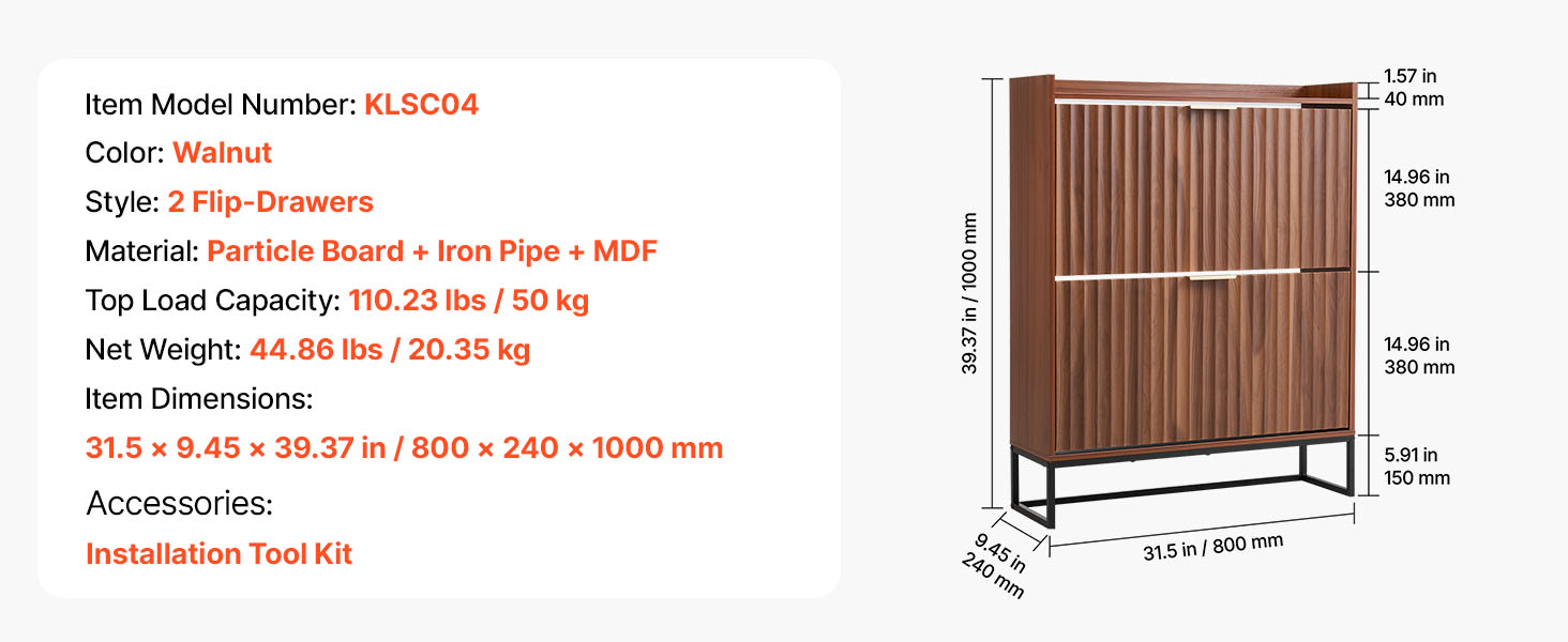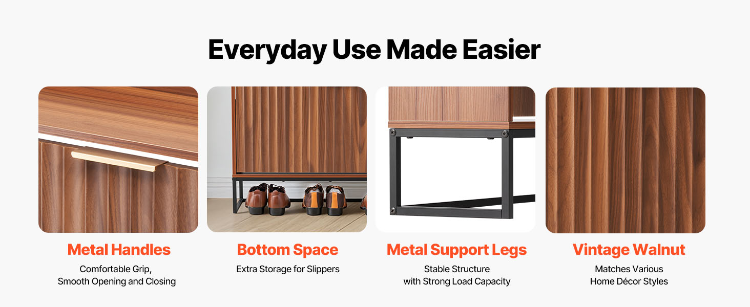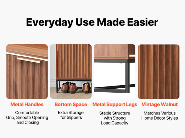 Vintage walnut finish with metal handles and metal support legs for strong stability. Bottom compartment stores everyday slippers, combining style and practicality.