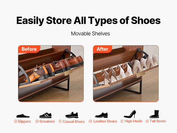 - Large Storage Capacity: Equipped with 2 flip drawers, each featuring two storage layers for easy access to frequently used shoes with a single flip. The top surface accommodates decorations or vases, while the bottom compartment stores slippers.