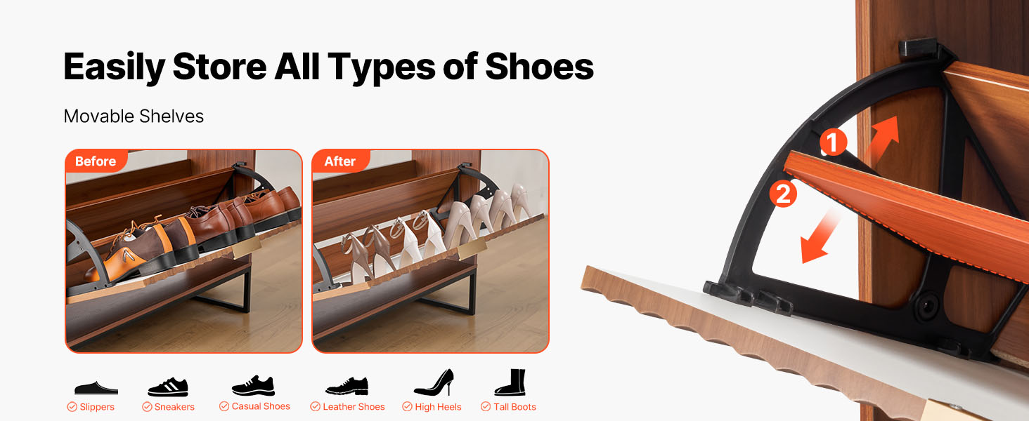 - Adjustable Shelves: The shelves are adjustable in 2 positions, and the middle divider can be removed to accommodate shoes of different heights and sizes. Fits high boots, ankle boots, heels, flats, and sneakers to meet the footwear needs of the entire family.