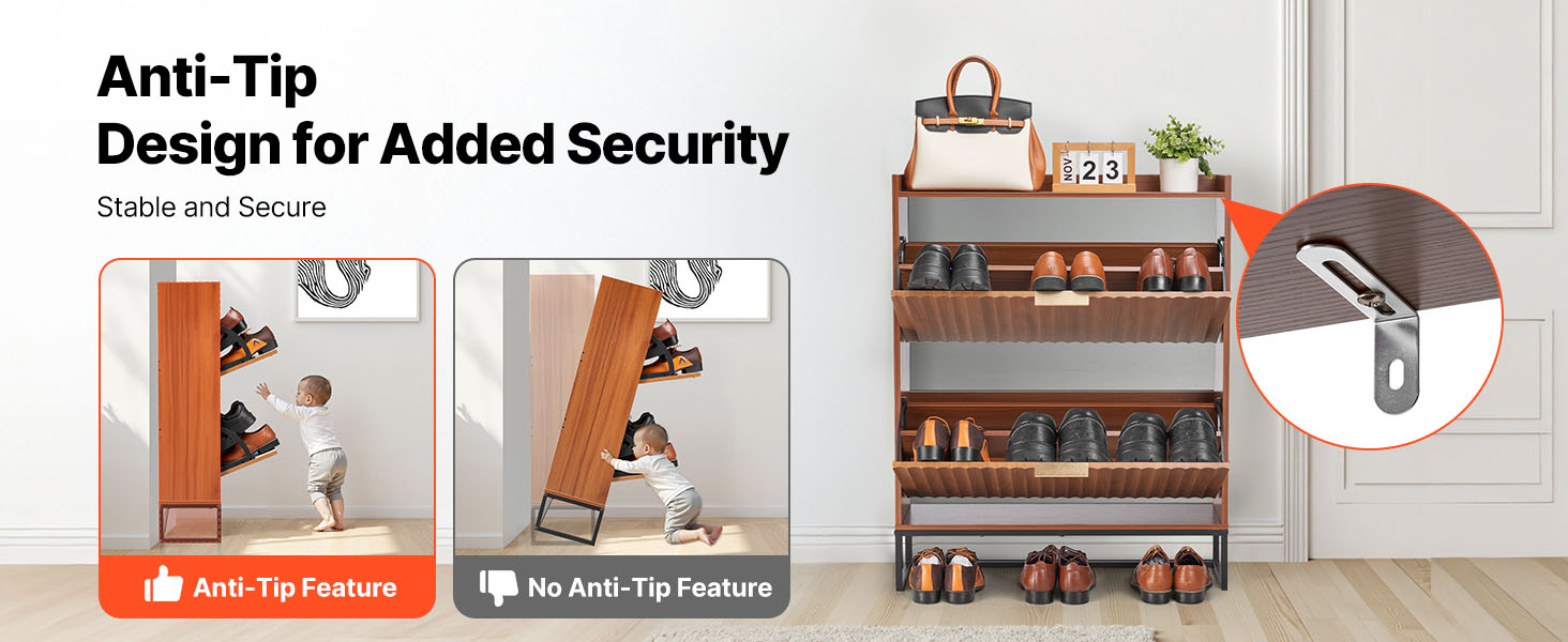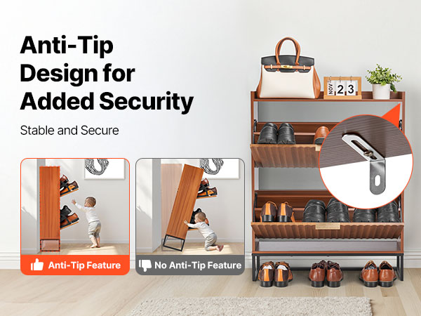 Equipped with an anti-tip device to securely fix the shoes storage cabinet to the wall, avoiding accidental tipping and enhancing stability.