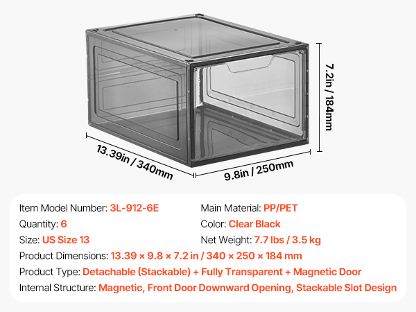 - Spacious and Versatile: Generous size (13.39 x 9.8 x 7.2 in) fits a wide range of shoe types and sizes. Our stackable shoe boxes are also ideal for hats, clothing, small items, toys, and more. The clear design allows you to quickly find what you need.
