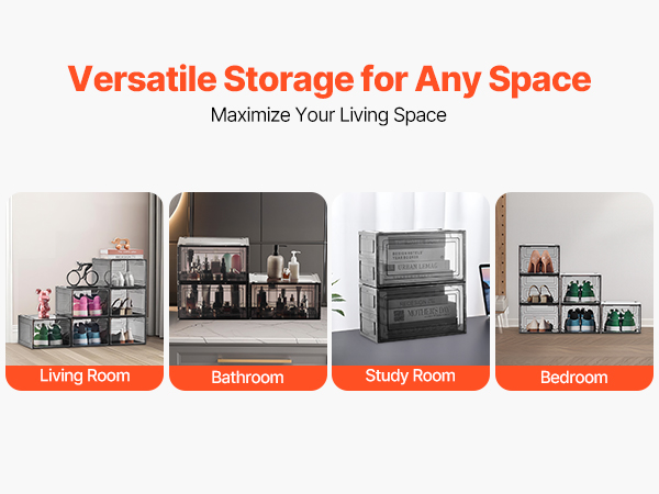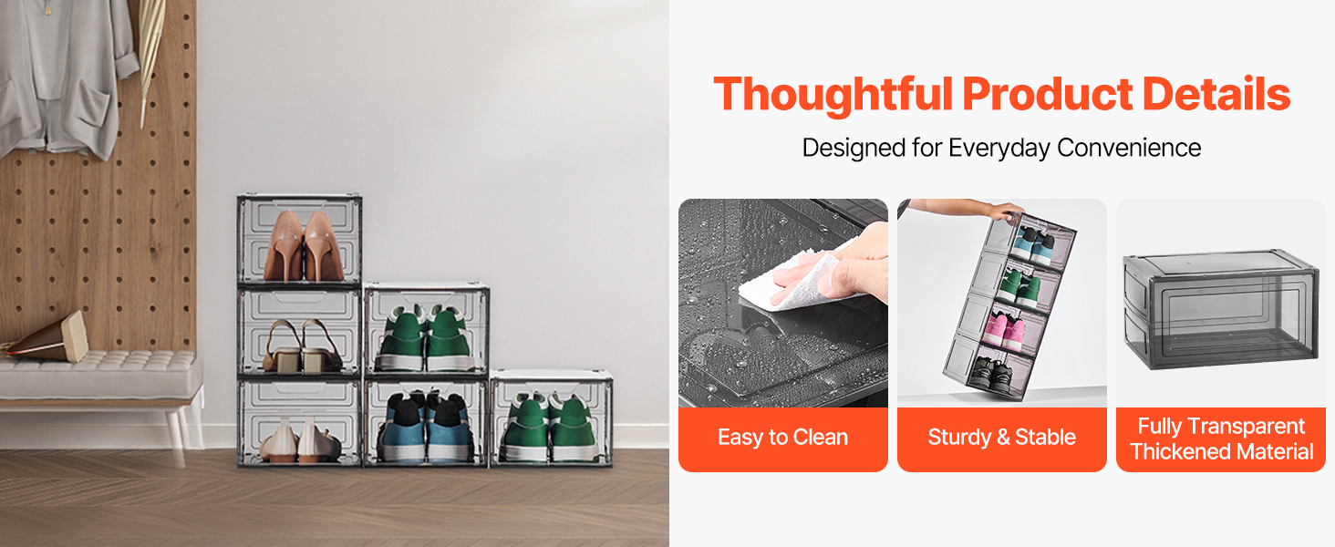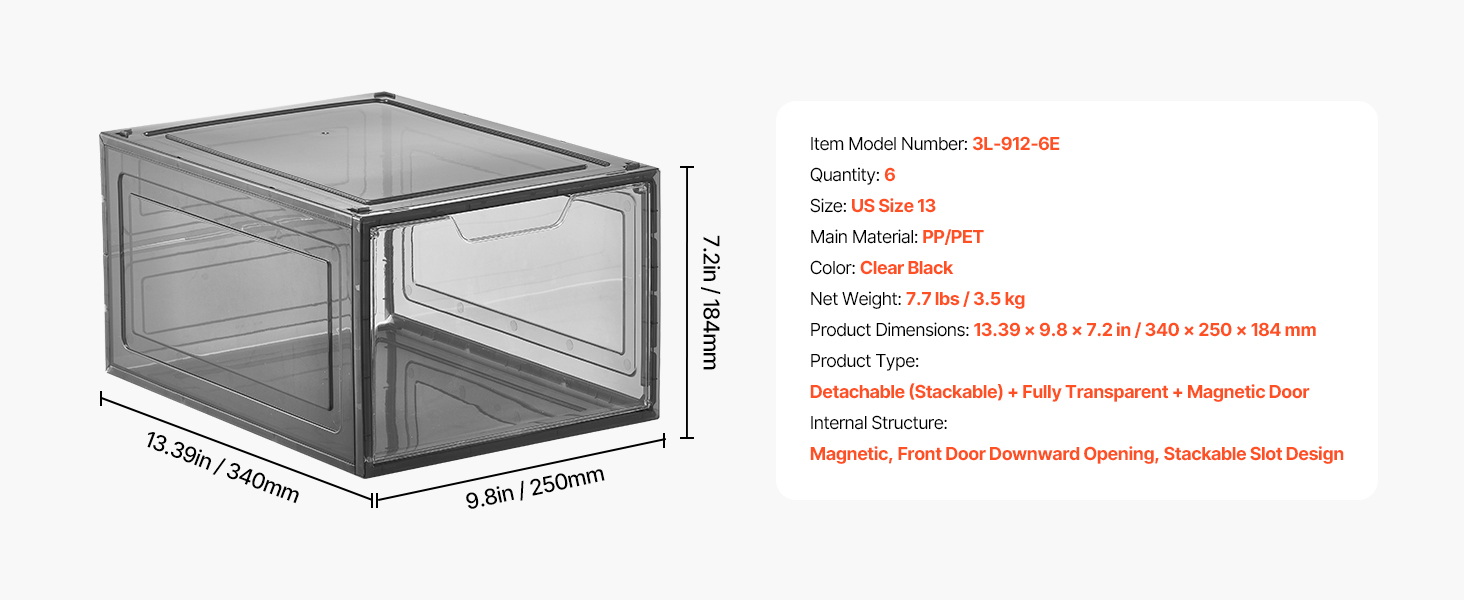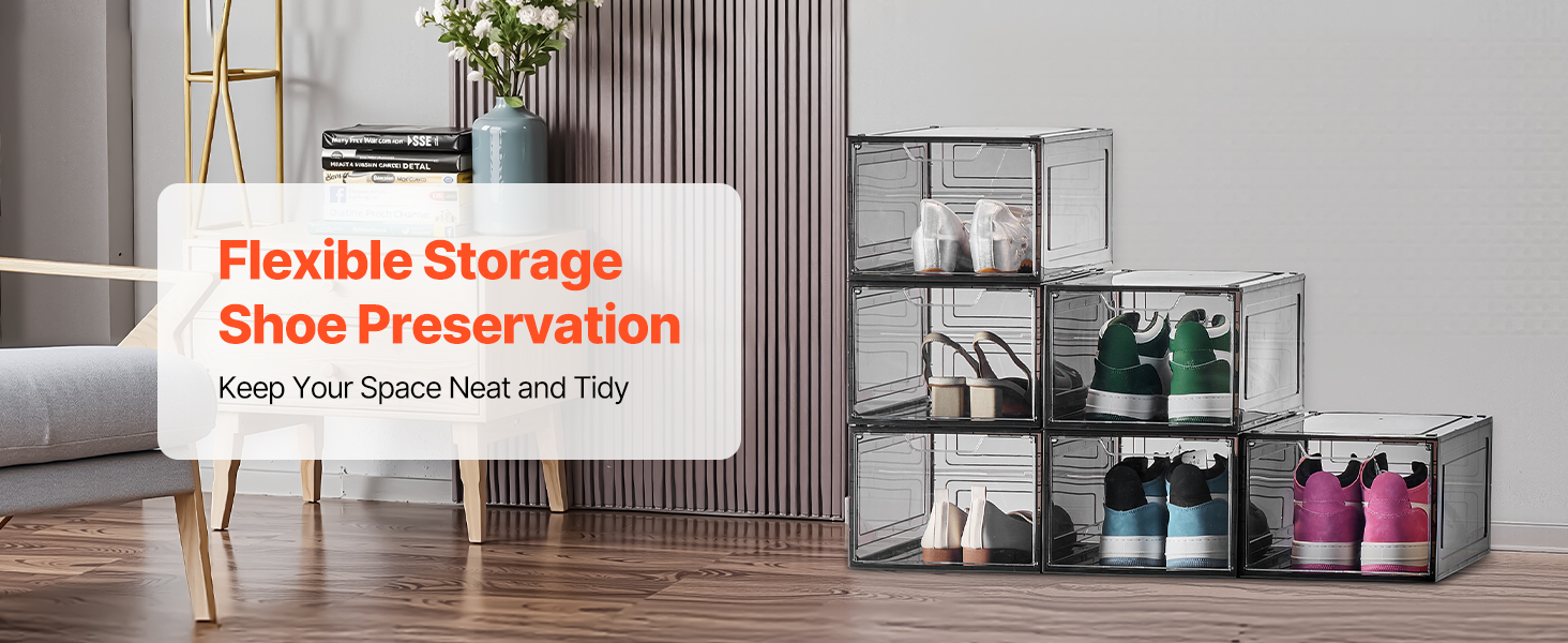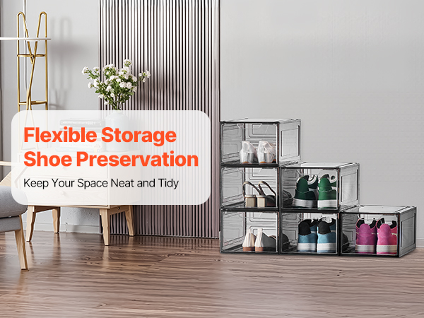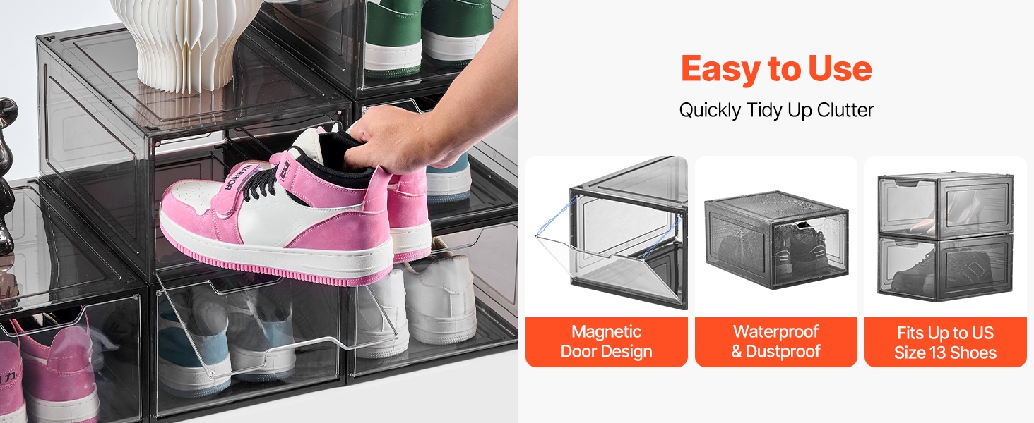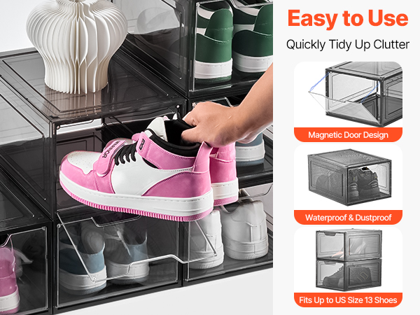 These spacious shoe organizer boxes fits up to US Size 13 shoes. The magnetic door design keeps your shoes dust-proof and water-proof, providing maximum care for your footwear.