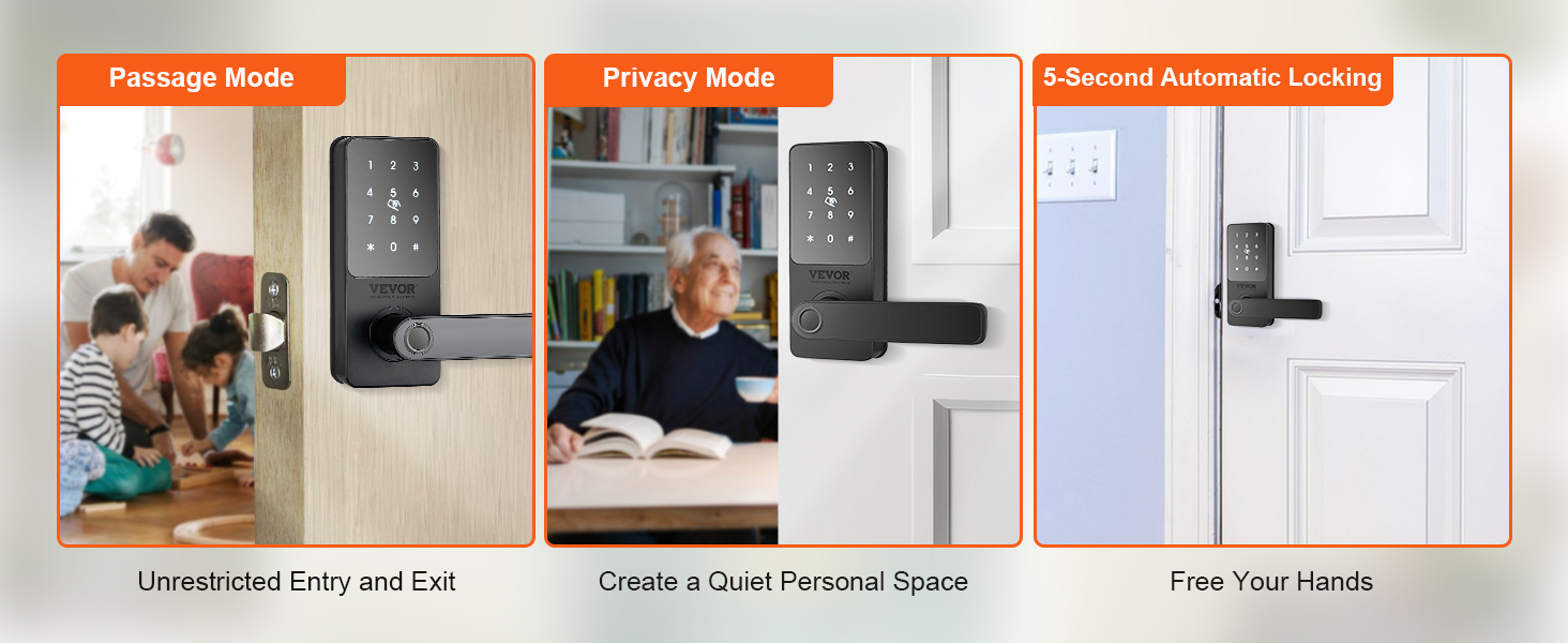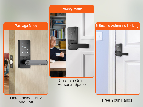 Setting the passage mode allows free entry without opening the door, making the front door lock set especially suitable for home gatherings. Activate privacy mode to create an undisturbed space instantly. It automatically locks when you leave, freeing up your hands.
