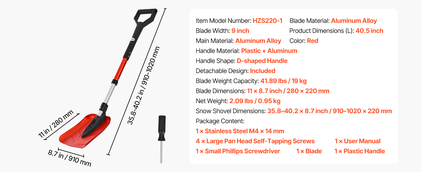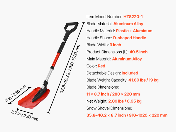 | Snow Shovel Dimensions | 35.8-40.2 x 8.7 in/910-1020 x 220 mm |