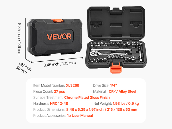 Designed for portability, the case of the metric socket set measures 8.46 x 5.35 x 1.97 inch / 215 x 136 x 50 mm. Its compact size fits easily into tight spaces or can be carried on the go, ensuring efficient work anywhere.