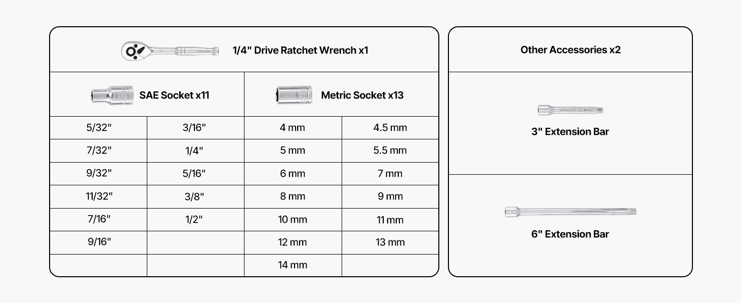 - Easy-to-Read Sizes: Size markings on the socket tool set are precision-rolled for clear, raised engraving, allowing quick and accurate identification by sight or touch—even in low light or greasy conditions—greatly improving work efficiency
