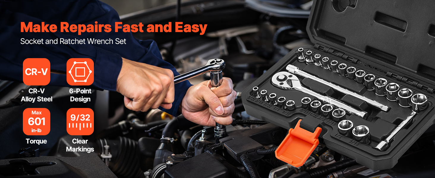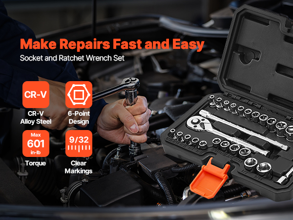 - High Torque Design: Engineered with a 6-point configuration, this socket and ratchet set evenly distributes pressure on fasteners to minimize wear. Its high-torque capability delivers up to 601 IN-LB, easily handling rusted or tightly secured bolts.