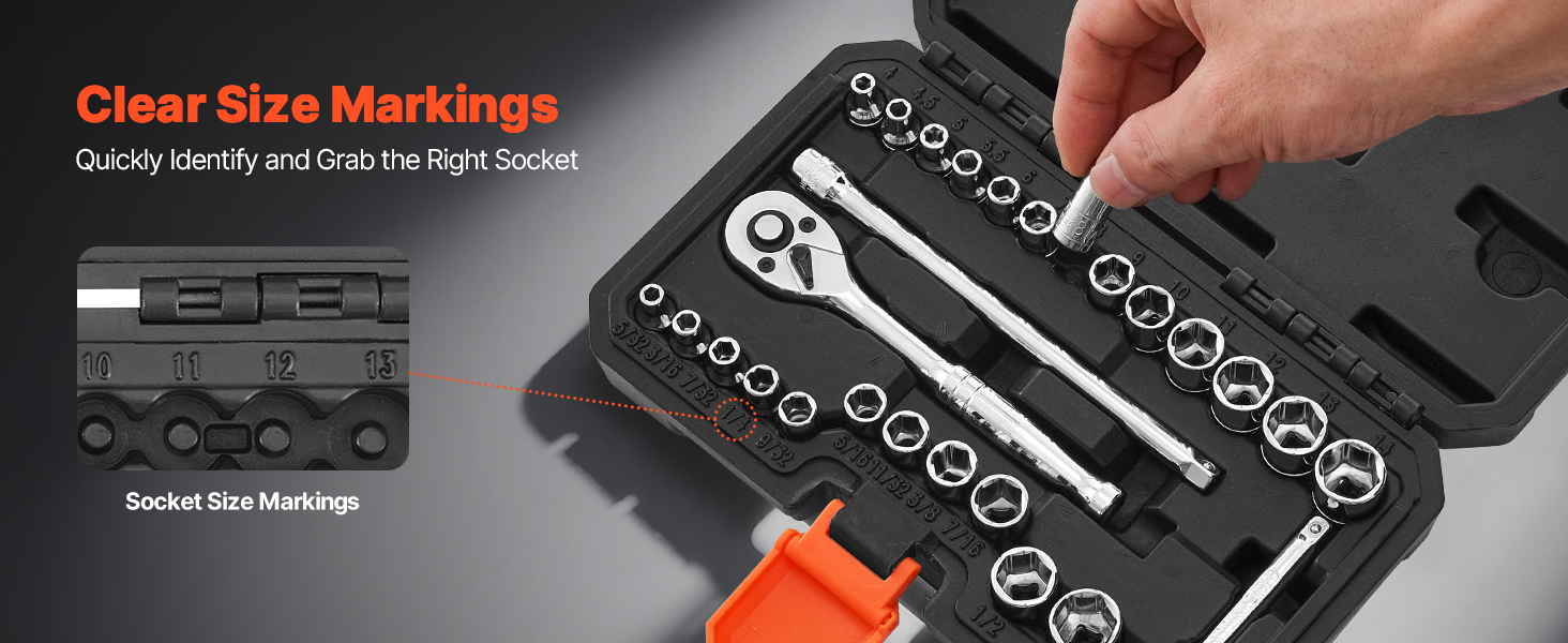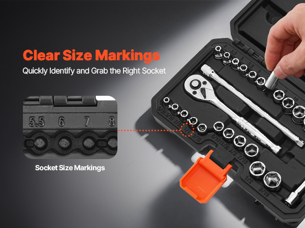 Each socket features engraved, easy-to-read size markings that are highly wear-resistant. This socket tool set ensures quick identification and faster access to the right tool when you need it.