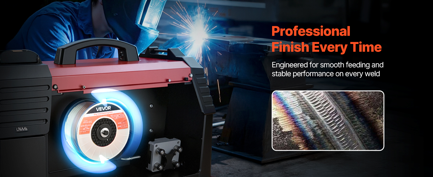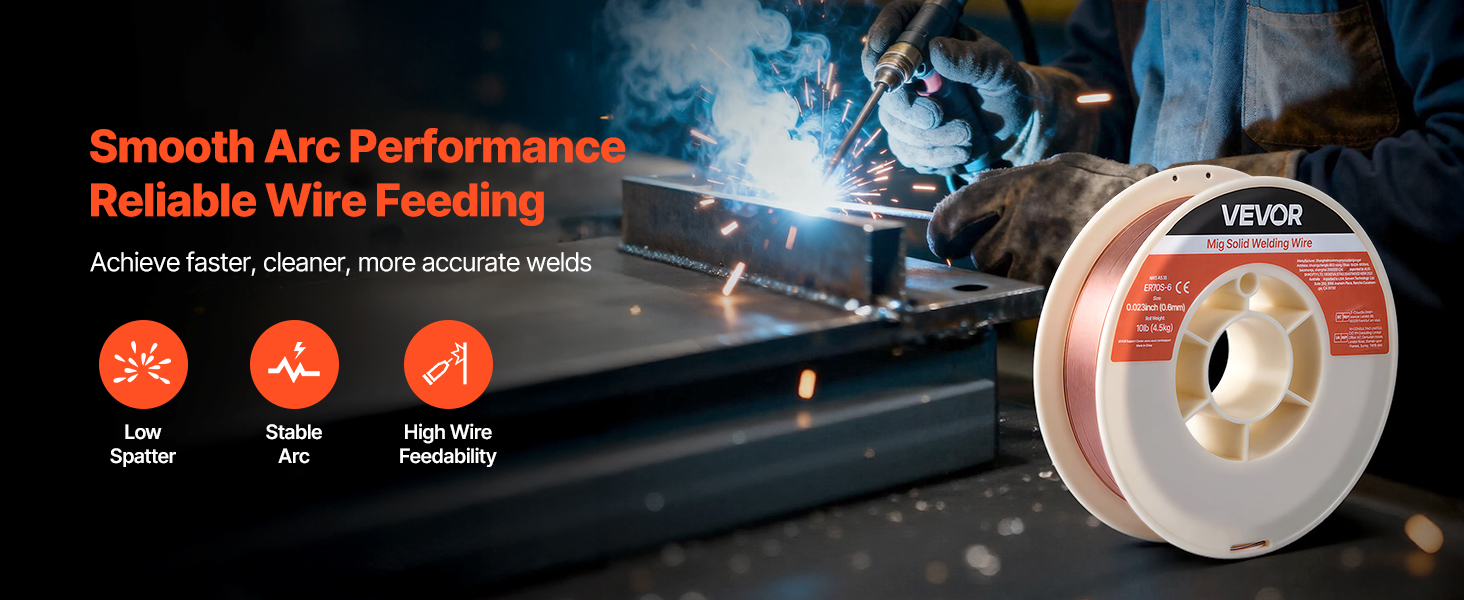 VEVOR 0.023″ 10 lbs ER70S-6 solid MIG welding wire delivers strong, consistent welds with smooth wire feeding, low spatter, and stable arc action. Supports all-position welding and high tensile strength for reliable performance in automotive, machinery, and DIY welding projects.
