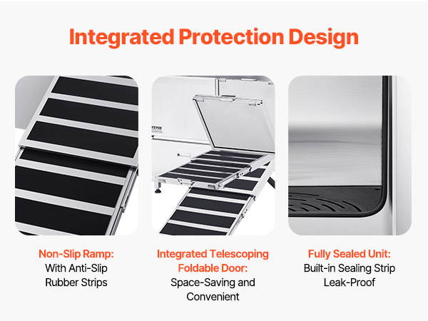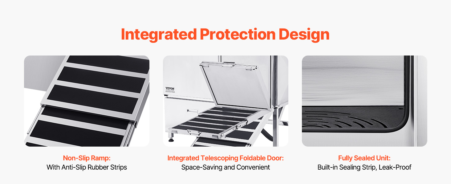 - Foldable and Space-Saving: The integrated foldable ramp door can be shortened and folded upwards to function as a door panel. The upgraded sealing system and anti-slip ramp ensure pets can enter and exit securely without slipping. The drainage kit prevents odor buildup, ensuring no water accumulation or leaks during bath time.
