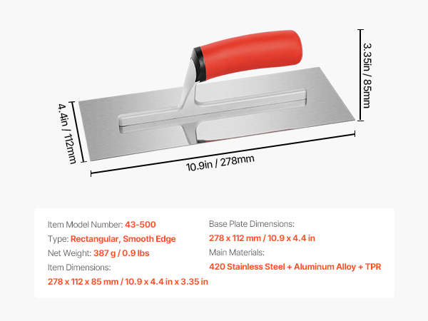 - Even Application: The 278 x 112 mm / 10.9 x 4.4 in wide scraper design increases the contact area between the trowel and the surface, allowing for an even application of materials, ensuring flatness and uniformity in the finished surface.