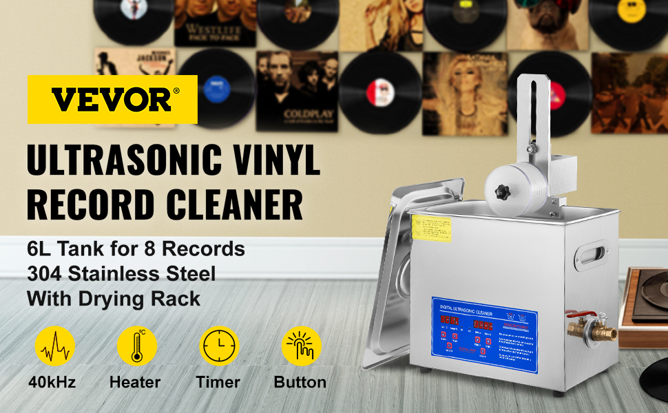 This ultrasonic cleaner 6L includes a removable metal stand with a waterproof label cover that can be rotated by a motor to wash six records simultaneously and accepts 7″-12″ vinyl records.