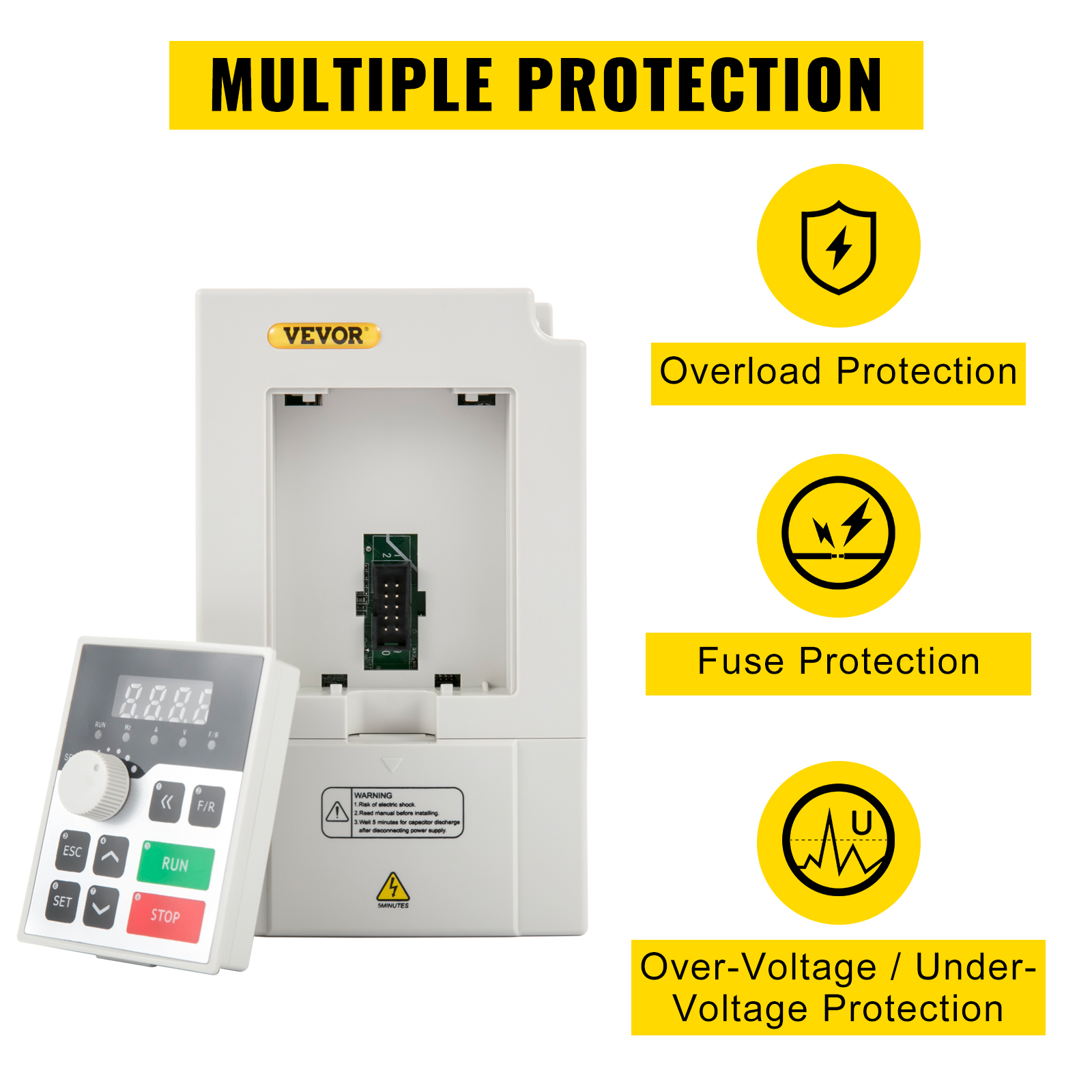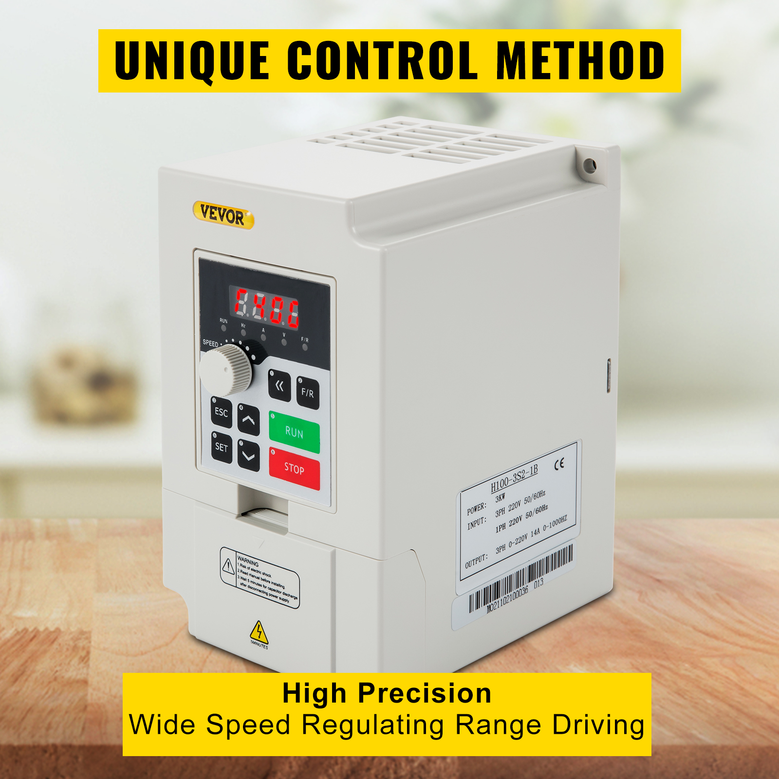 - Powerful Function: This variable frequency drive accepts 1- or 3-phase input and delivers 3-phase output. Control modes include V/F control and vector control. Frequency setting options: digital, analog, serial communication (RS485 port, compliant with standard international MODBUS protocol for main circuit control), PID control (advanced calculus-based closed-loop arithmetic, rapid response, and high suitability). Multiple control techniques, both synchronized and non-synchronized, enable fast start-up without changing brakes. High torque under heavy load, delivering full torque at 1Hz.
