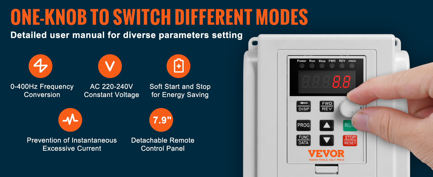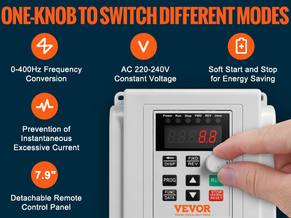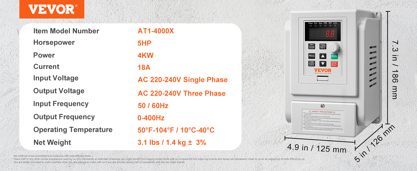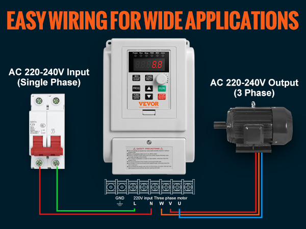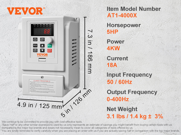 - High Quality: The VEVOR 4KW 18A 5HP VFD features a single-phase AC 220-240V input and three-phase AC 220V-240V output, ensuring soft start and stop, steady motor control, and energy efficiency. Input Frequency: 50/60Hz; Output Frequency: 0-400Hz