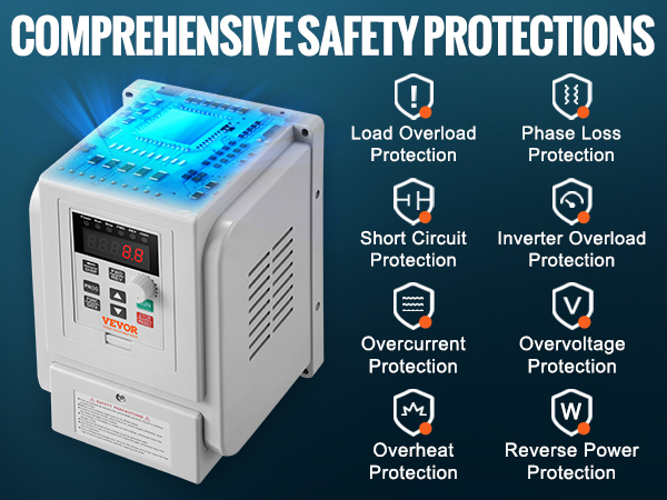 - Safety & Durability Redefined: Our VFD features a 10-layer protection system, safeguarding against overcurrent, overload, overvoltage, phase loss, and more. Enhanced by the triple-proof paint circuit board, we prioritize both your safety and the product's longevity.