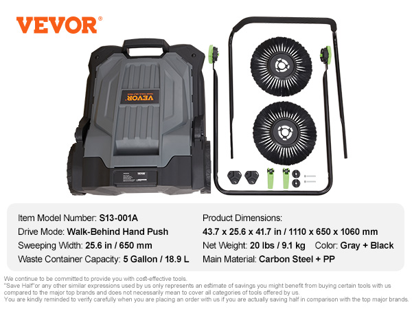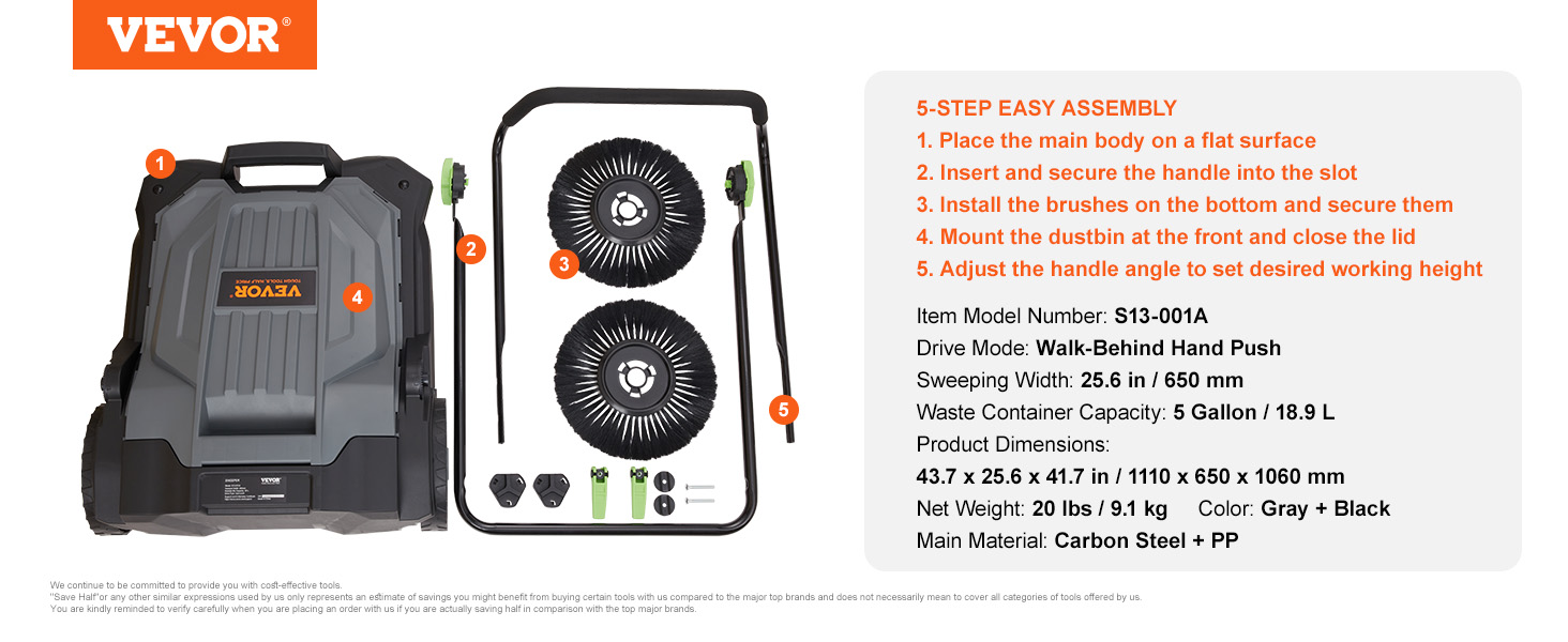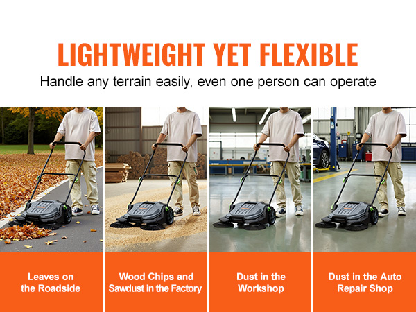- Easy to Operate: Constructed from high-quality plastic and metal with surface paint treatment, the VEVOR manual hand push sweeper features superior texture and durability. Its lightweight design and exceptional maneuverability enable effortless operation by a single user. With a simple 5-step assembly process, it is ready for immediate use anywhere.