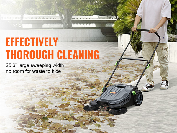 - Sweeping Faster and Smarter: The VEVOR walk-behind hand push floor sweeper employs a human-powered sweeping mechanism, eliminating dependence on electricity or fuel. Unlike laborious brooms requiring repetitive back-and-forth motions, our large side brushes cover a 25.6-inch sweeping path in a single pass, ensuring thorough and rapid cleaning — 5 times faster than traditional brooms.