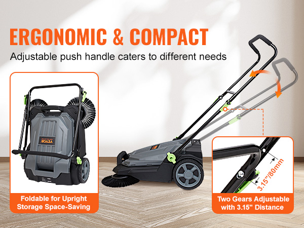 - Adjustable & Foldable Handle: The angle and height of the push handle are adjustable in two gears, ensuring a perfect fit for users of all heights and operating the manual floor sweeper more comfortably. Additionally, the foldable handle allows for easy upright storage, taking up minimal storage space. Such an ergonomic, compact, and space-saving sweeper, you deserve it!