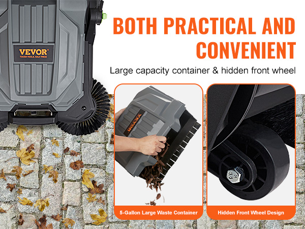 Equipped with a 5-gallon waste container, making cleaning a breeze in one go, without the need for frequent garbage emptying. The hidden front wheel and 2 large rear wheels allow easy handling on various surfaces, whether flat or challenging terrains, it can easily cope with them all.