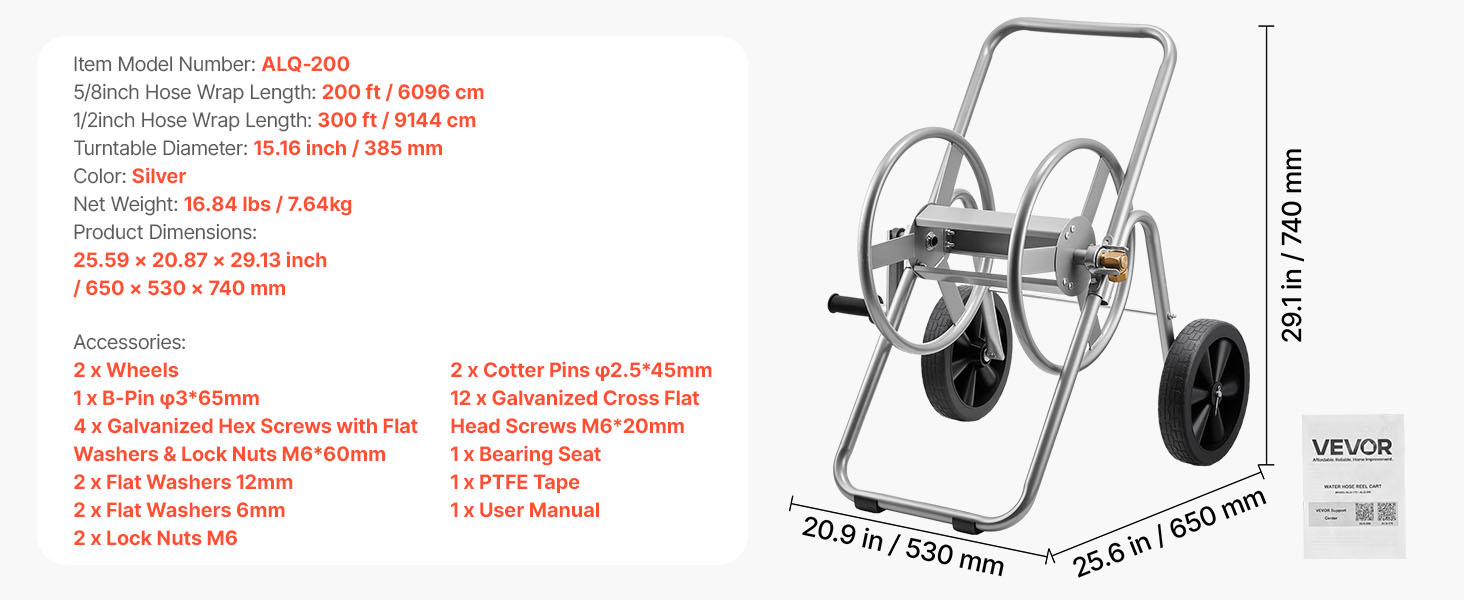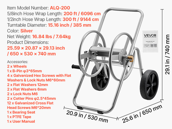 Made from Q235A steel with brass fittings, this water hose reel cart holds 300ft (9144cm) of 1/2″ (12.7mm) or 200ft (6096cm) of 5/8″ (15.88mm) hose. Gear-drive rewind enables easy retraction, while its low center and non-slip wheels keep it steady on grass, gravel, or uneven ground.