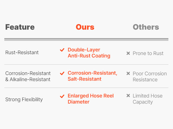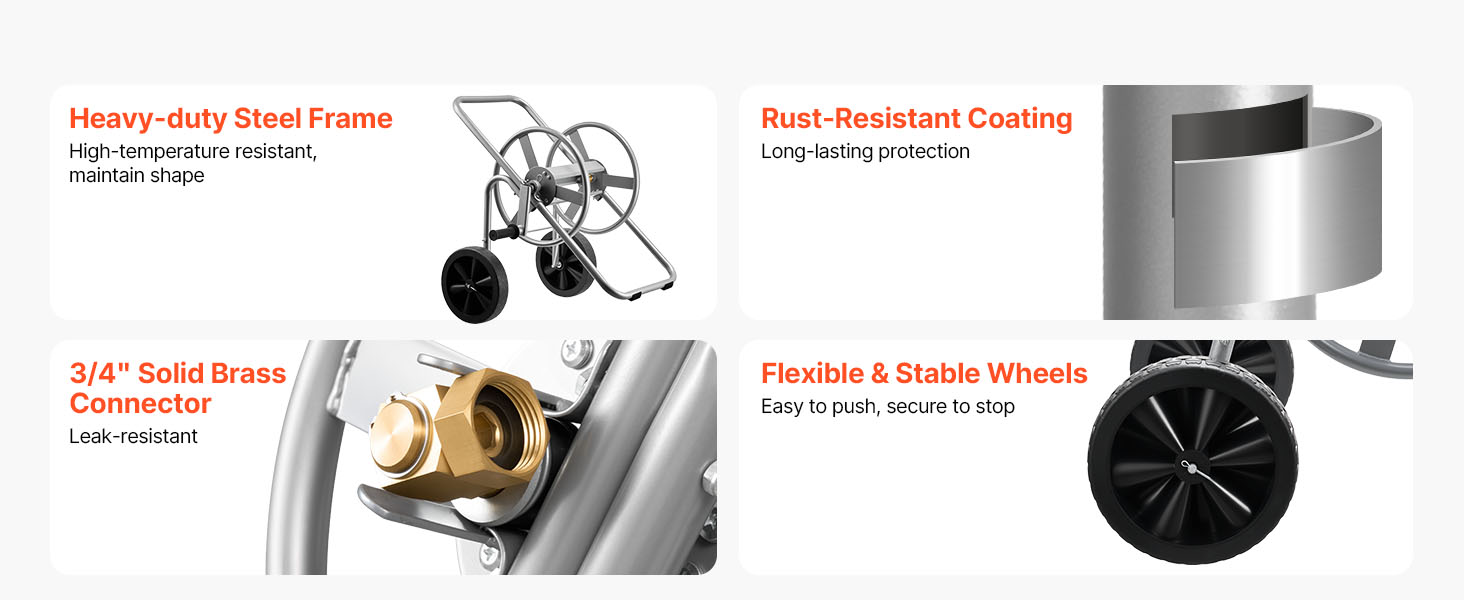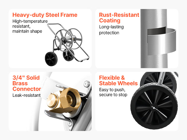 - Corrosion-Resistant Build: Constructed with Q235A steel and brass quick-connect fittings, this garden hose cart passed rigorous salt-spray testing. It withstands rain and high-pressure water without rust or leakage, ensuring dependable performance for residential and commercial cleaning applications.