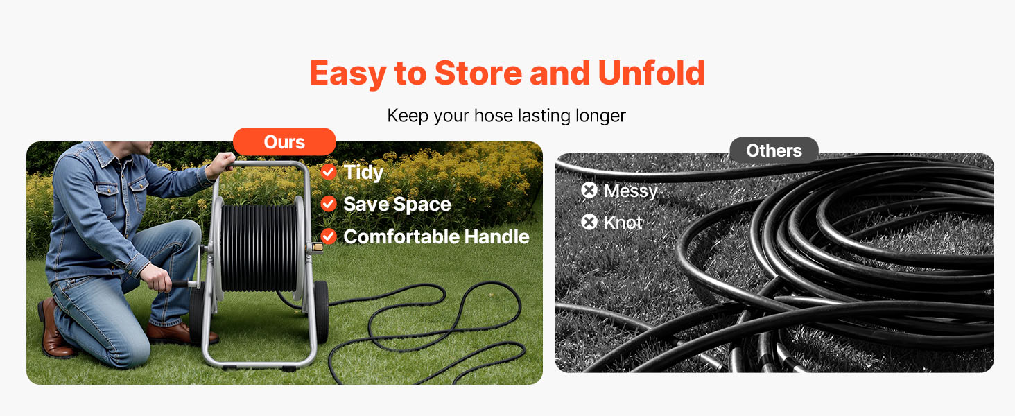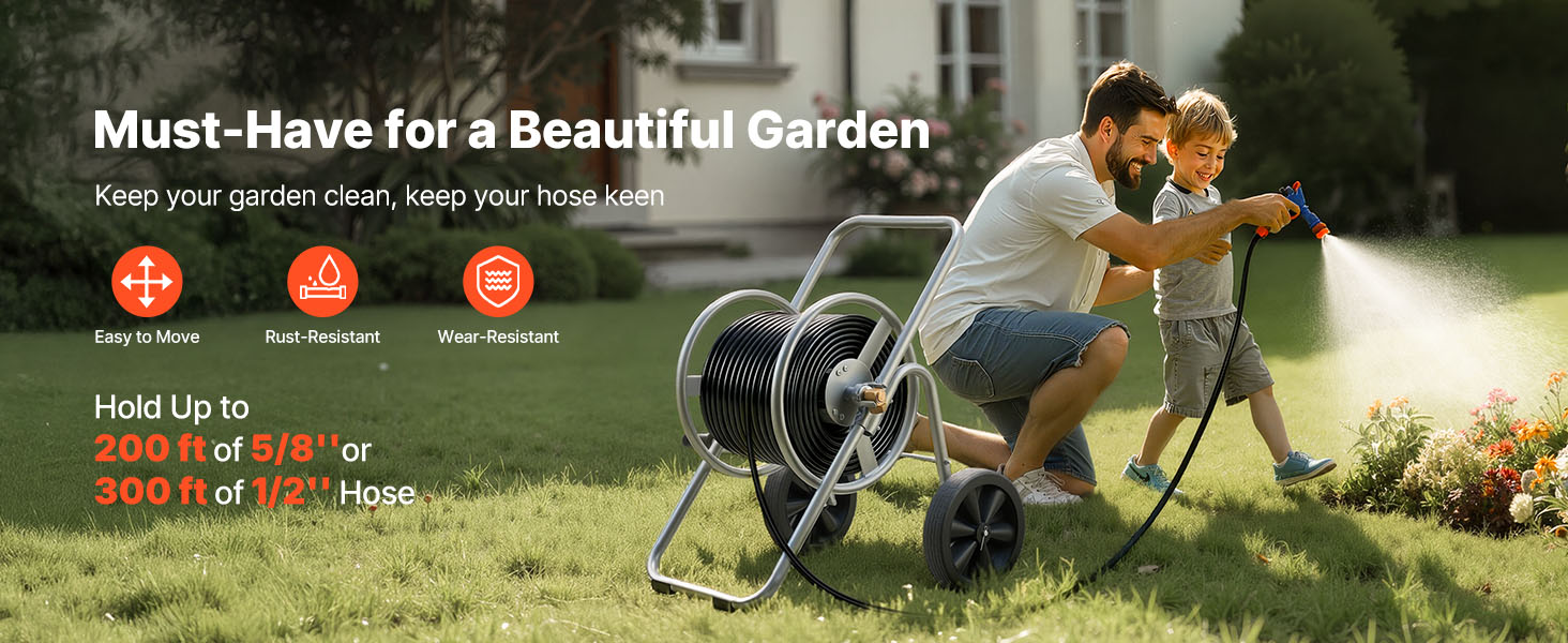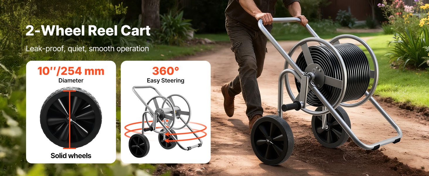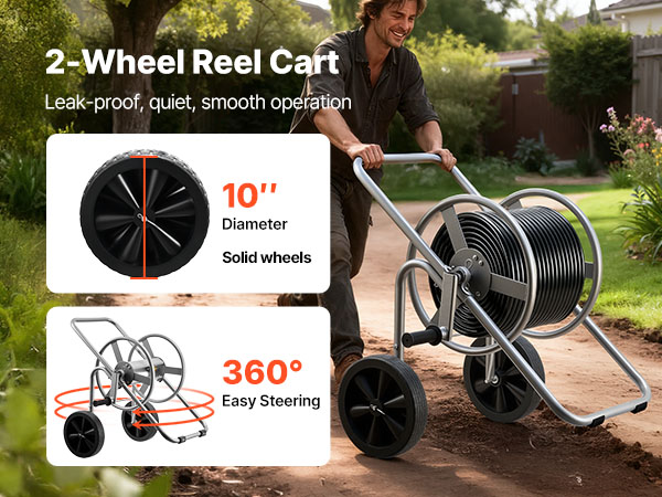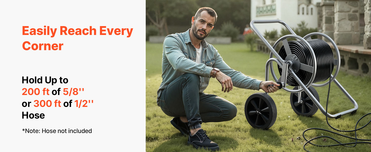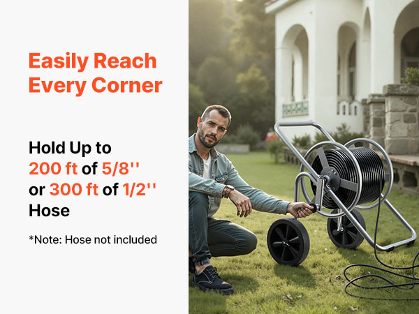 - Large Reel Design: This hose cart with wheel accommodates up to 300 ft (9144 cm) of 1/2" (12.7 mm) or 200 ft (6096 cm) of 5/8" (15.88 mm) hose. Its widened reel enables faster loading and effortless storage, eliminating reach limitations and allowing smooth maneuverability across yards or patios without frequent repositioning.