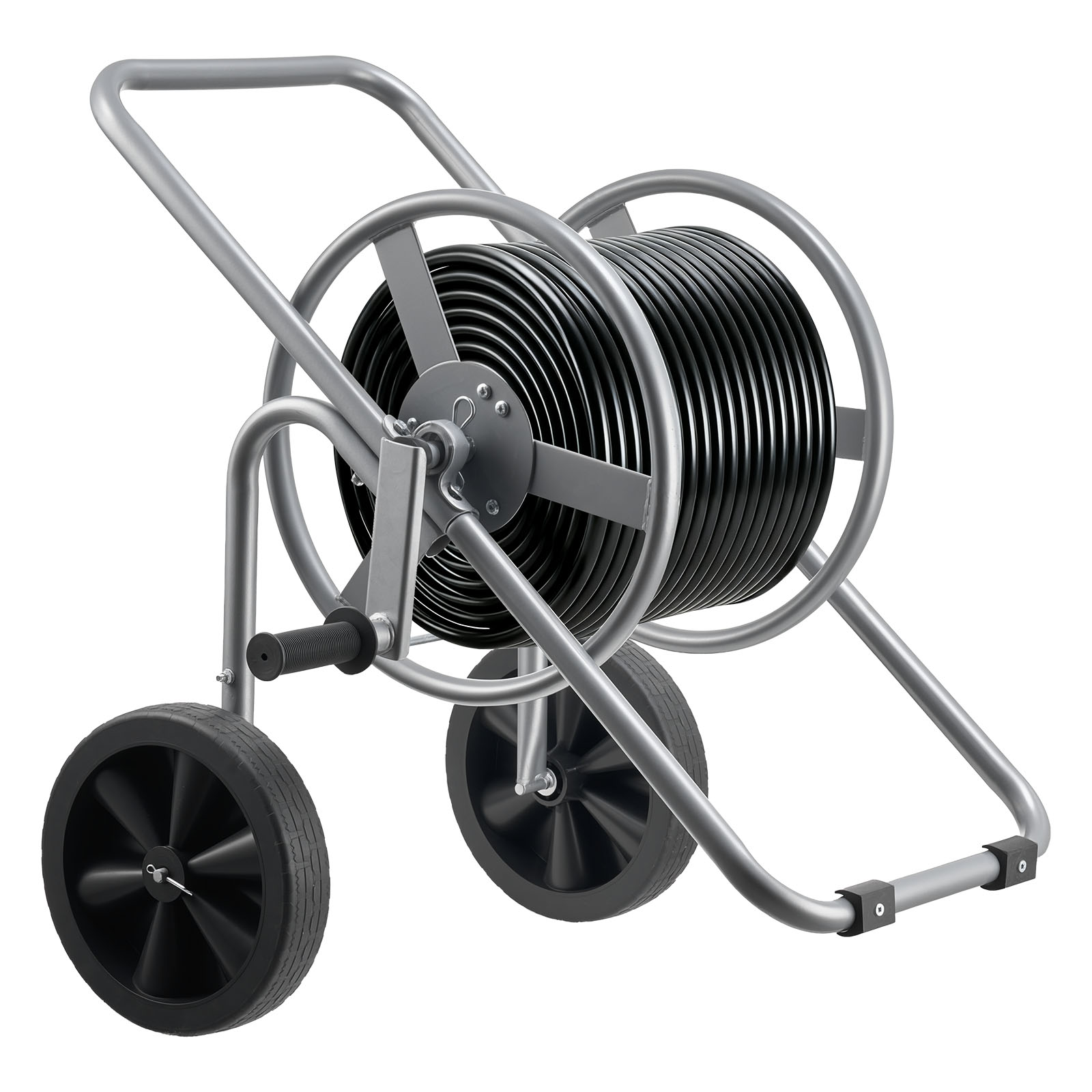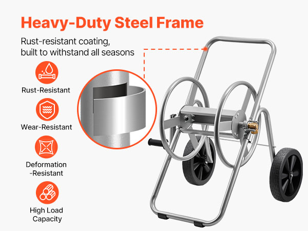 - Smooth Movement: Designed with non-slip wheels and a low-center frame, this water hose cart with wheel moves steadily across lawns, gravel, and rough terrain. Durable construction ensures stability under heavy loads, allowing easy transportation of hoses without tipping or extra effort.