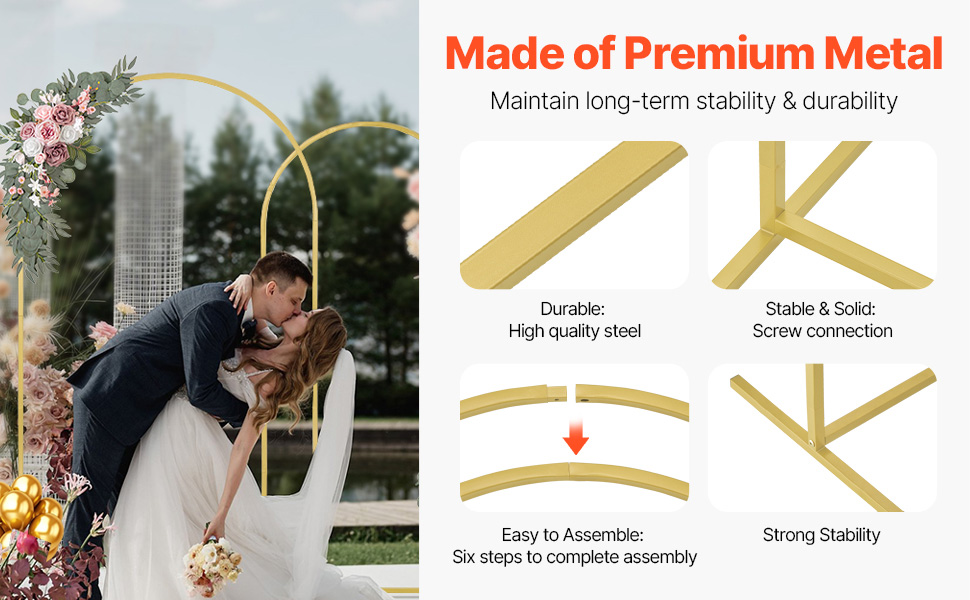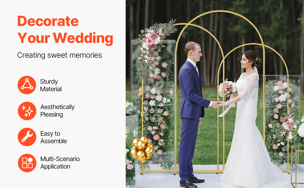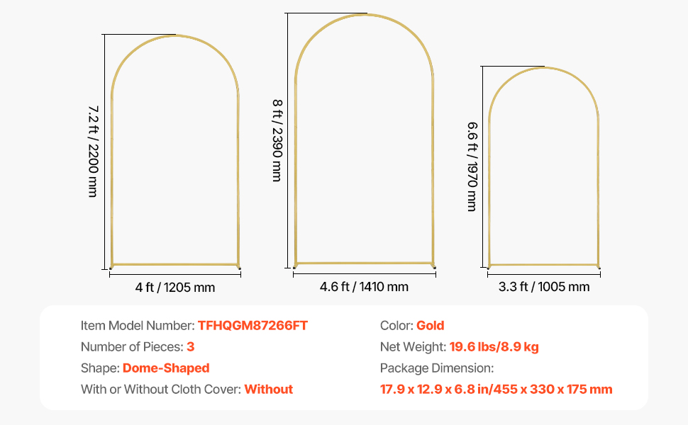 This 3-piece gold wedding arch backdrop stand, measuring 8 x 4.6 ft, 7.2 x 4 and 6.6 x 3.3 ft, adds romance and elegance to weddings, It becomes a photo-worthy focal point for guests. The upgraded 18 x 18 mm durable metal frame ensures stability and durability.