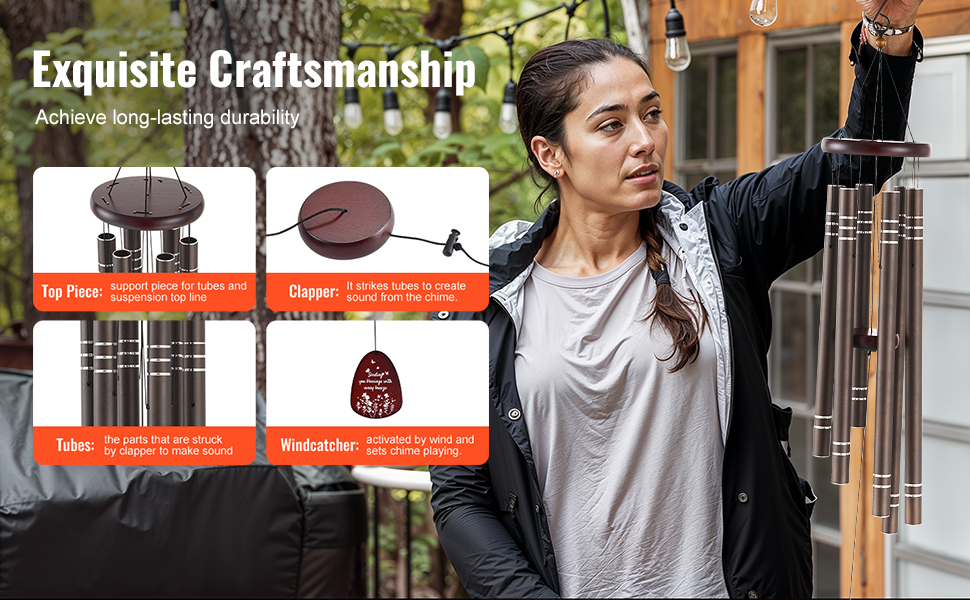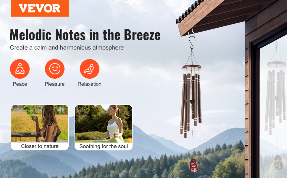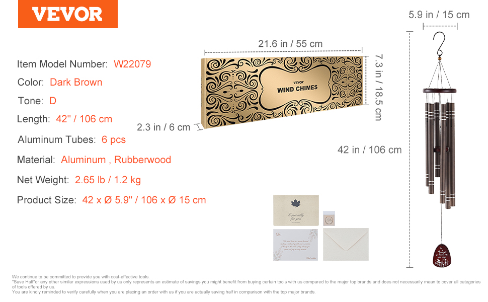 - 42-Inch Wind Chimes for Outside: Our bronze metal wind chimes feature 6 aluminum tubes, with the longest tube measuring 19.6" and a diameter of 0.9". The durable nylon cord and high-density clapper produce a rich, melodious sound. It includes a postcard, a greeting card, and an envelope.