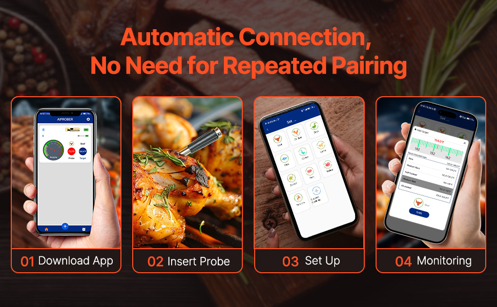 Pairing this Bluetooth meat probe takes just four simple steps. After the first setup, it will automatically reconnect for future use. Enjoy instant sync with your phone anytime, anywhere – quick and hassle-free!