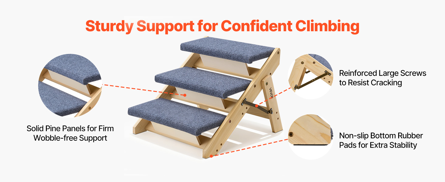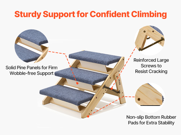 Pine wood boards with large screws provide durable support and reduce wobbling so pets can climb with confidence.