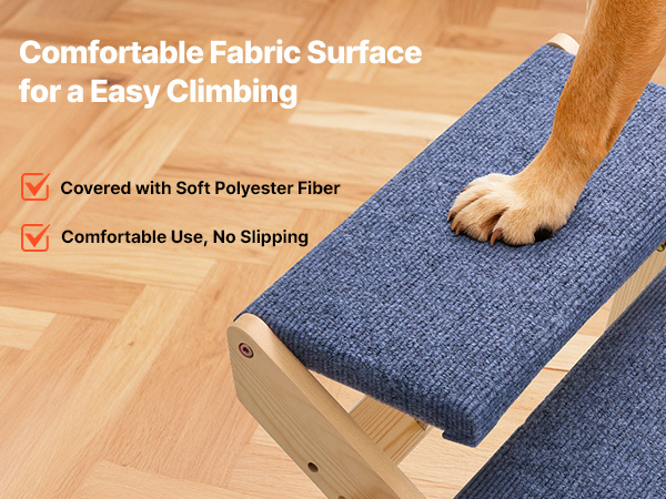 - Comfortable, Non-Slip Surface: The dog stairs for bed feature a soft polyester fabric cover that provides excellent traction for paws. It helps pets walk securely, avoids slipping, and makes climbing easier for your pets