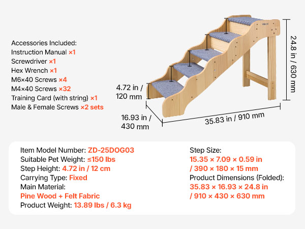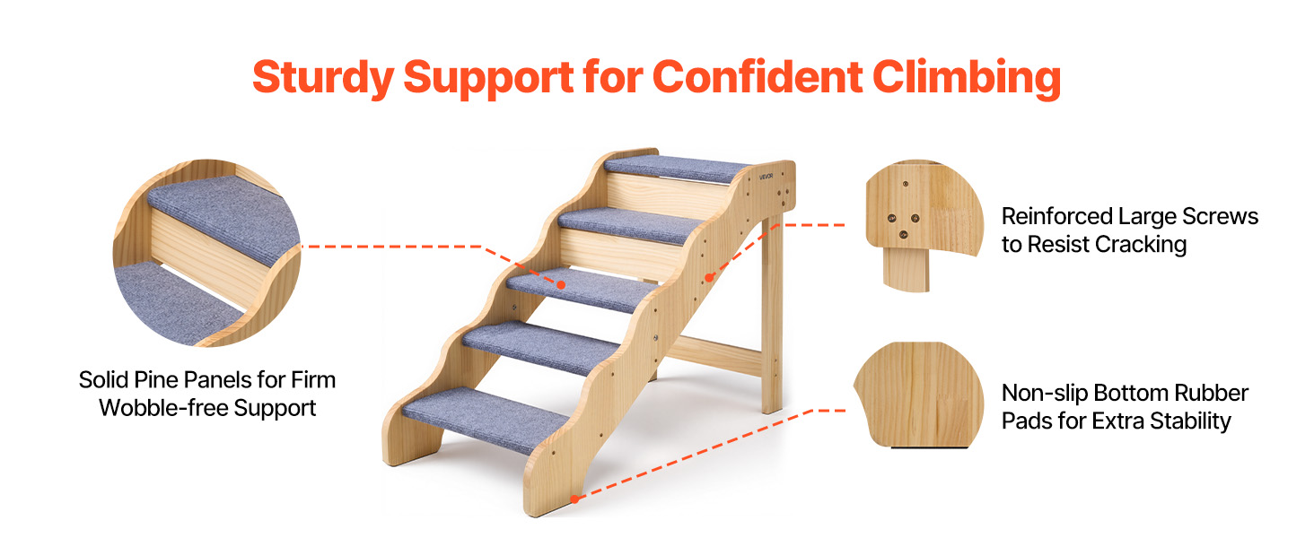 Pine wood boards with large screws provide durable support and reduce wobbling so pets can climb with confidence.