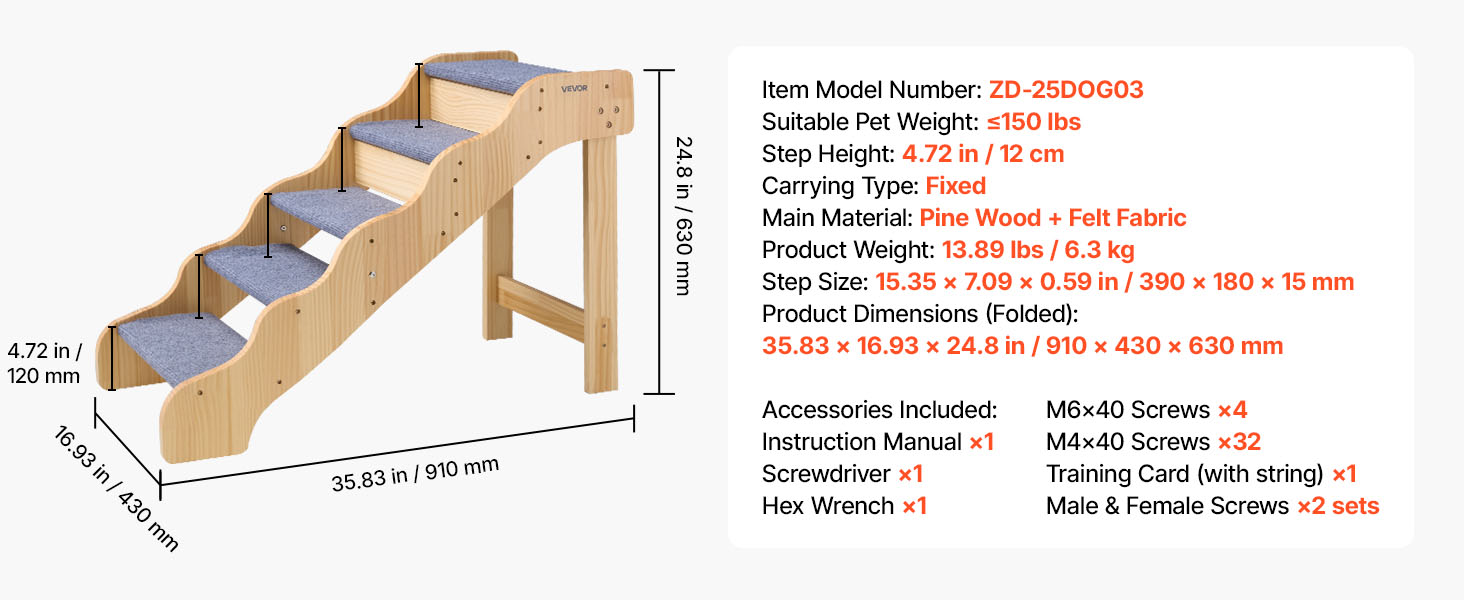 - Sturdy and Secure Support: The dog stairs feature a robust wooden frame designed to support pets up to 150 lbs (68 kg). Large screws enhance structural stability, and non-slip rubber pads on the bottom prevent wobbling, ensuring secure climbing for pets.