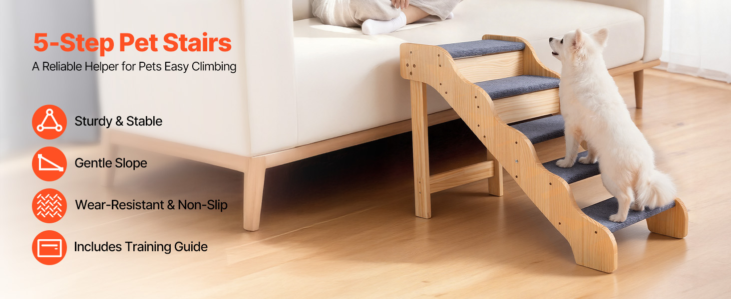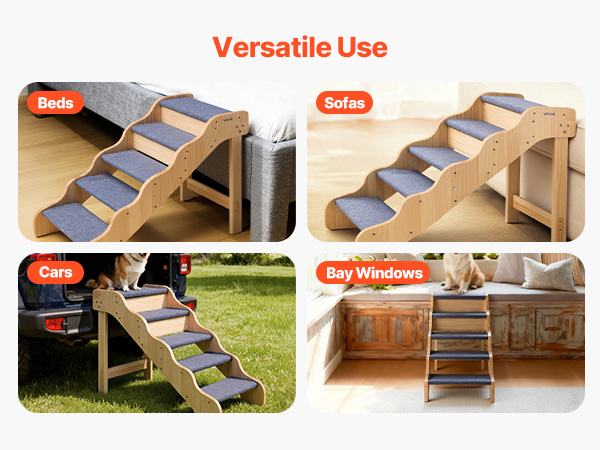 The 5-step design assists pets of all sizes, especially seniors, injured pets, or those with limited mobility, to reach beds and sofas securely. The sturdy structure offers support, while the lightweight build allows easy moving. Its clean, simple design blends seamlessly with any home decor
