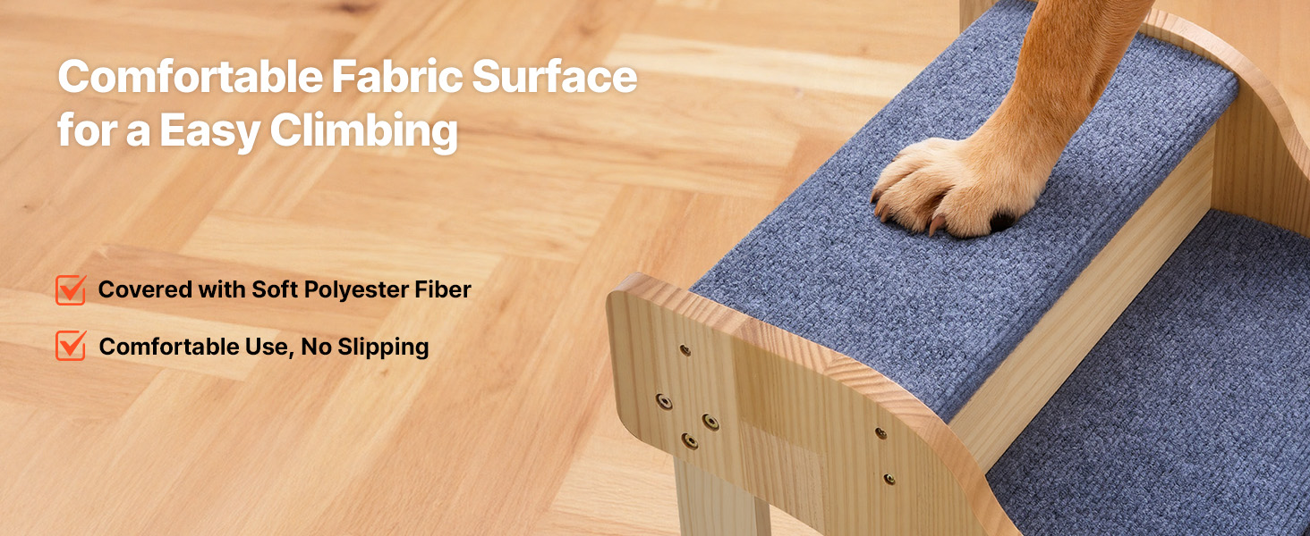 - Comfortable, Non-Slip Surface: The dog stairs for bed feature a soft polyester fabric cover that provides excellent traction for paws. It helps pets walk securely, avoids slipping, and makes climbing easier for your pets.