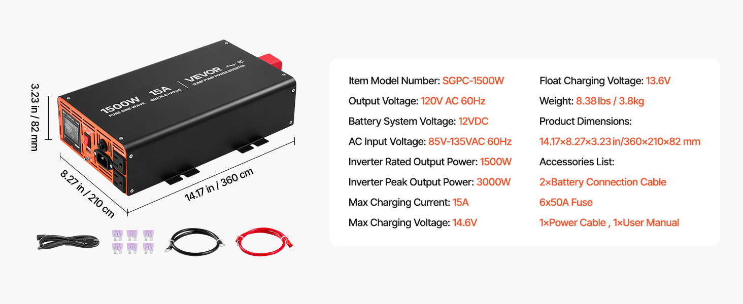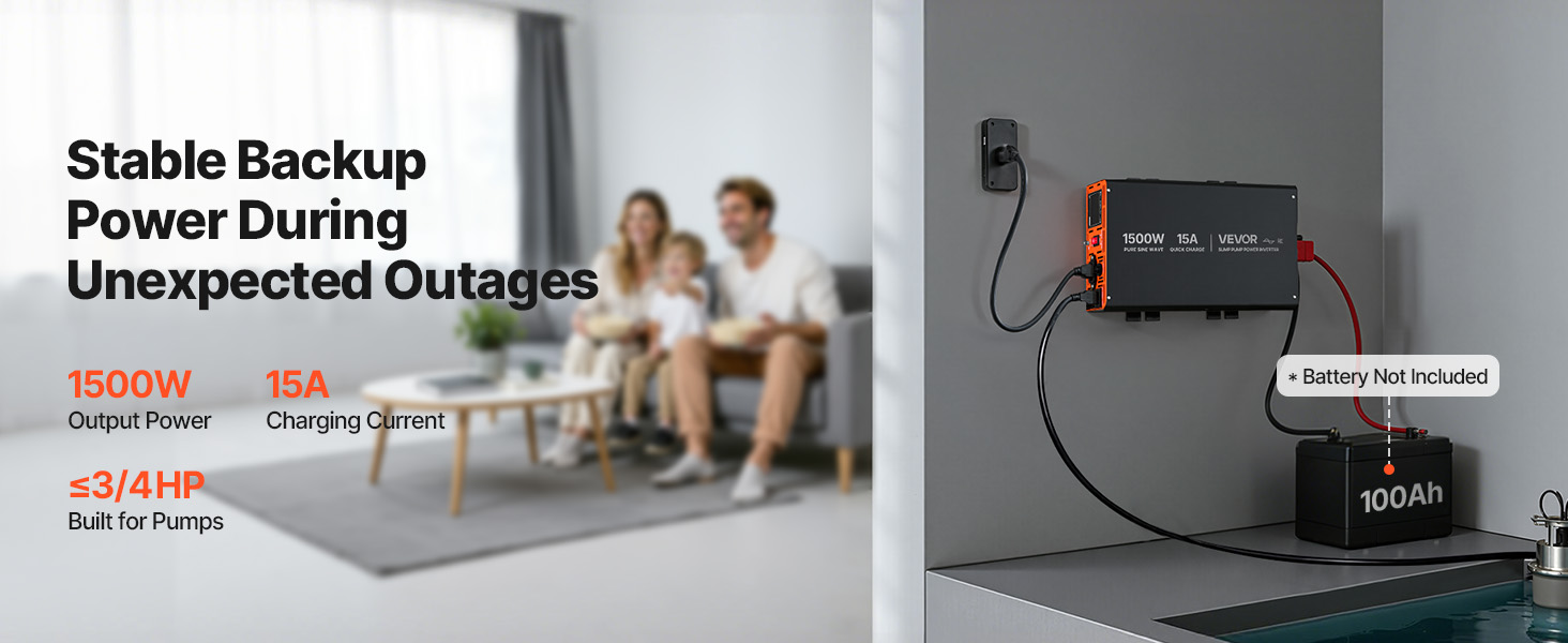 - Outstanding Performance: Delivers 1500W pure sine wave output, designed for ≤3/4 HP sump pumps. Features an AC outlet and USB port to quietly power daily drainage and emergency use without compromising sensitive equipment integrity.
