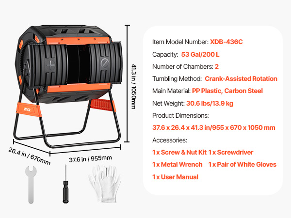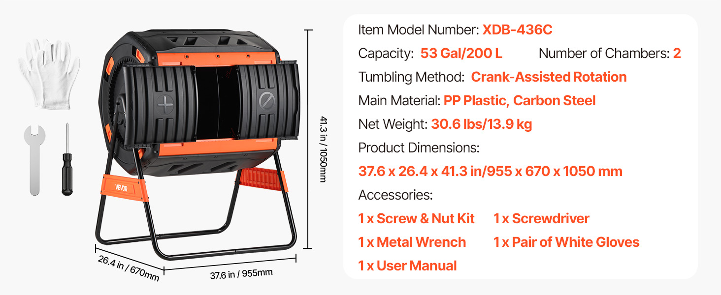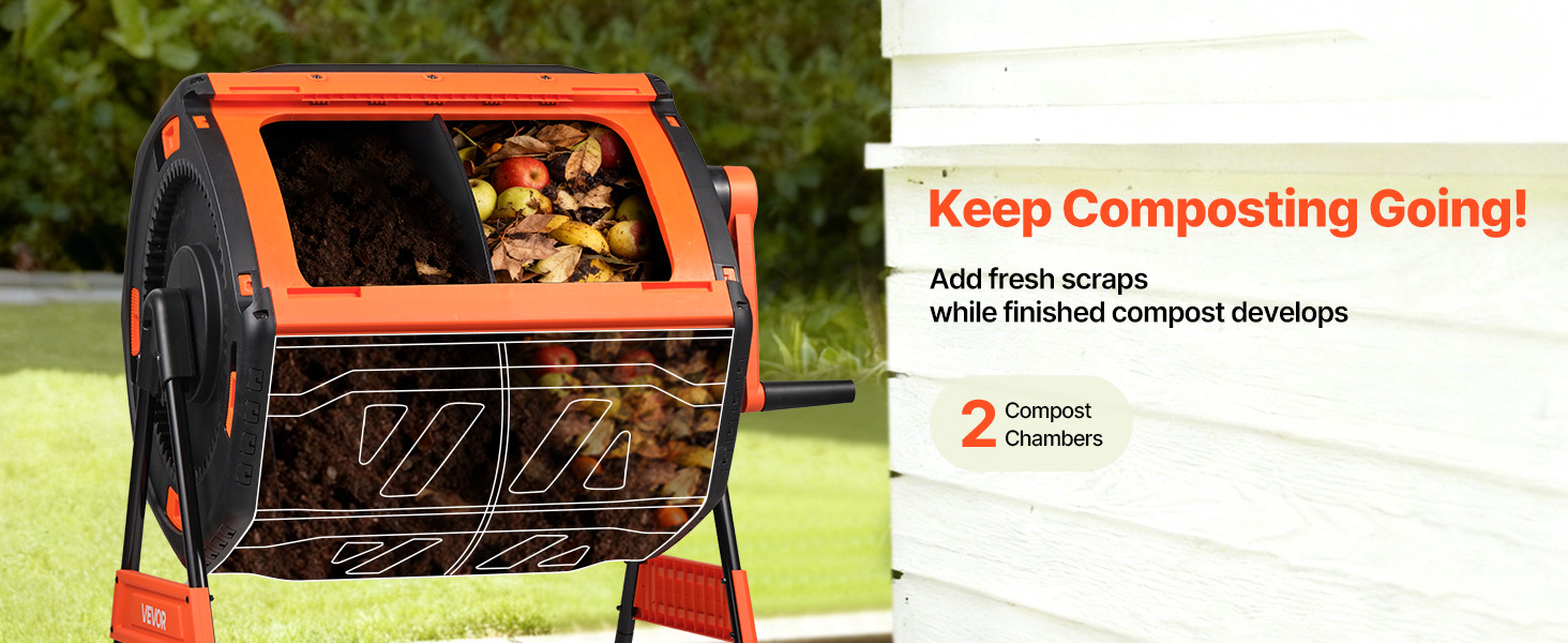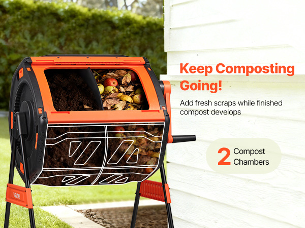 - Large Capacity & Dual-Chamber: This compost tumbler features a total capacity of 53 gal with dual chambers. While one side cures, new waste can be added to the other, enabling continuous and efficient composting for kitchen and garden materials.