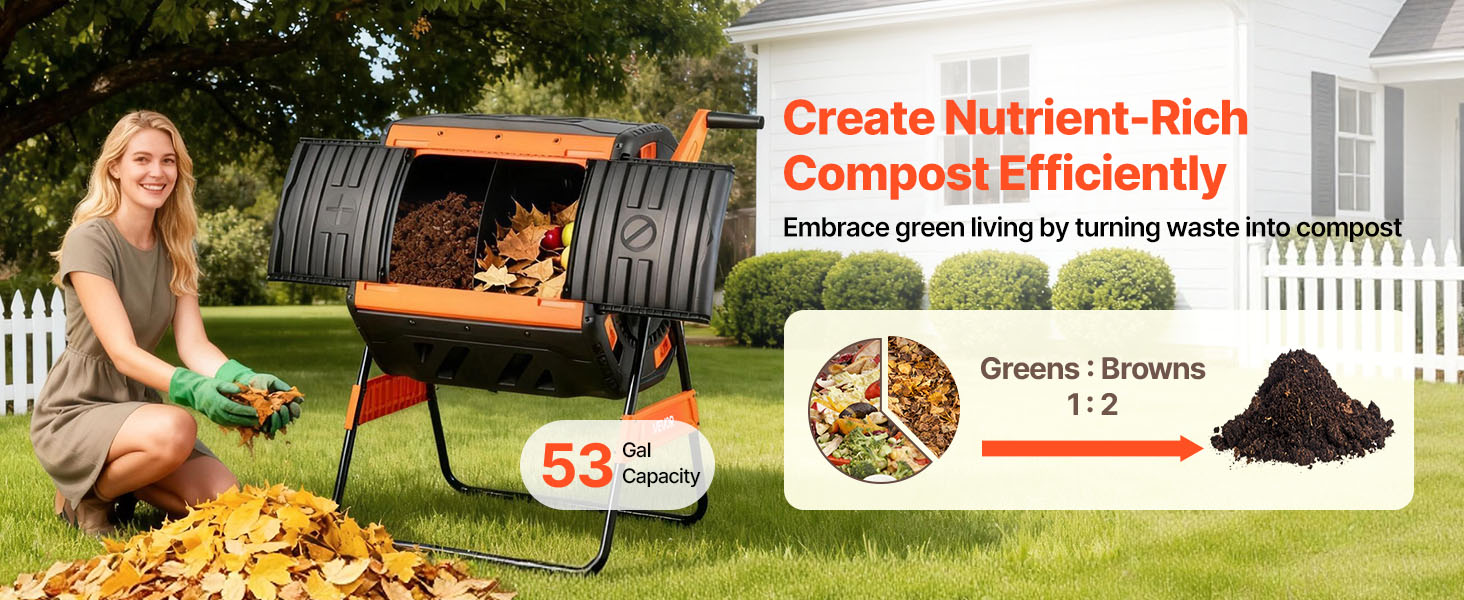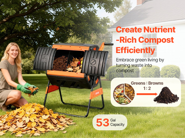Turn kitchen scraps and garden waste into nutrient-rich compost with this 53 gal dual-chamber compost tumbler—clean, efficient, and effortless for every home gardener.