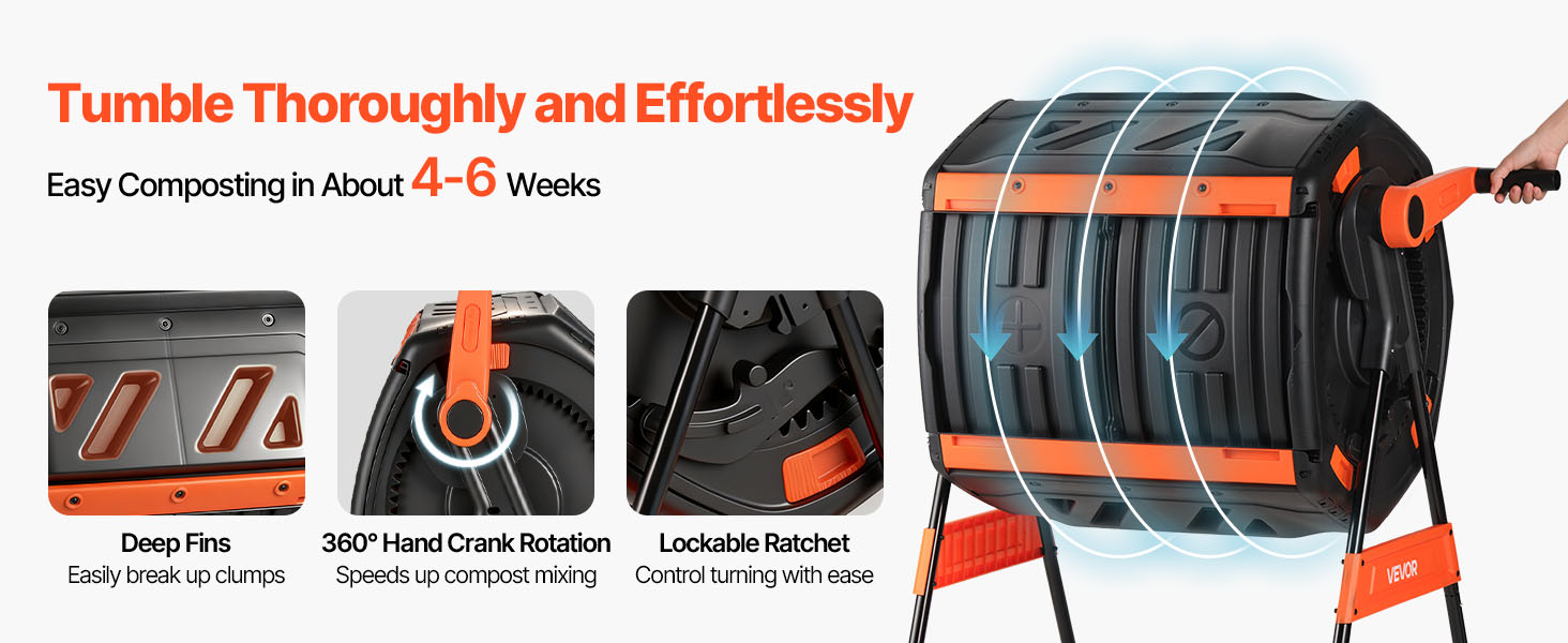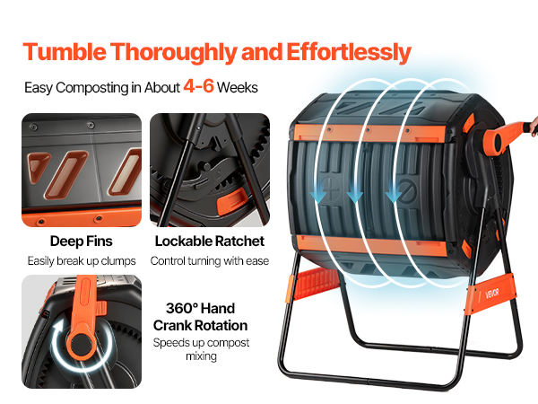 - Fast Composting: Achieve nutrient-rich compost in approximately 4-6 weeks using this outdoor tumbling composter. The smooth hand-crank shaft enhances mixing efficiency, deep fins facilitate clump breakdown, and the lockable ratchet provides precise control over turning frequency.