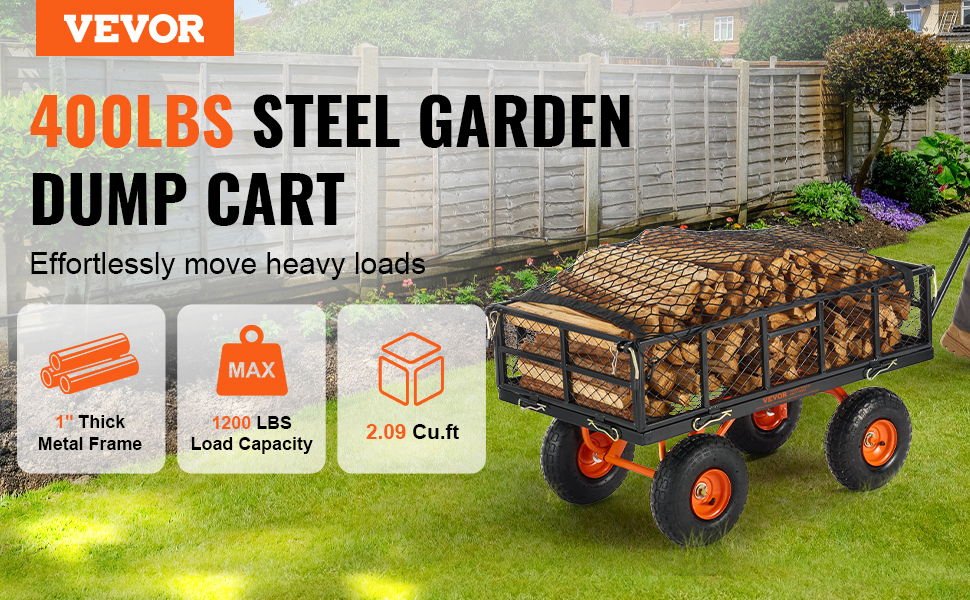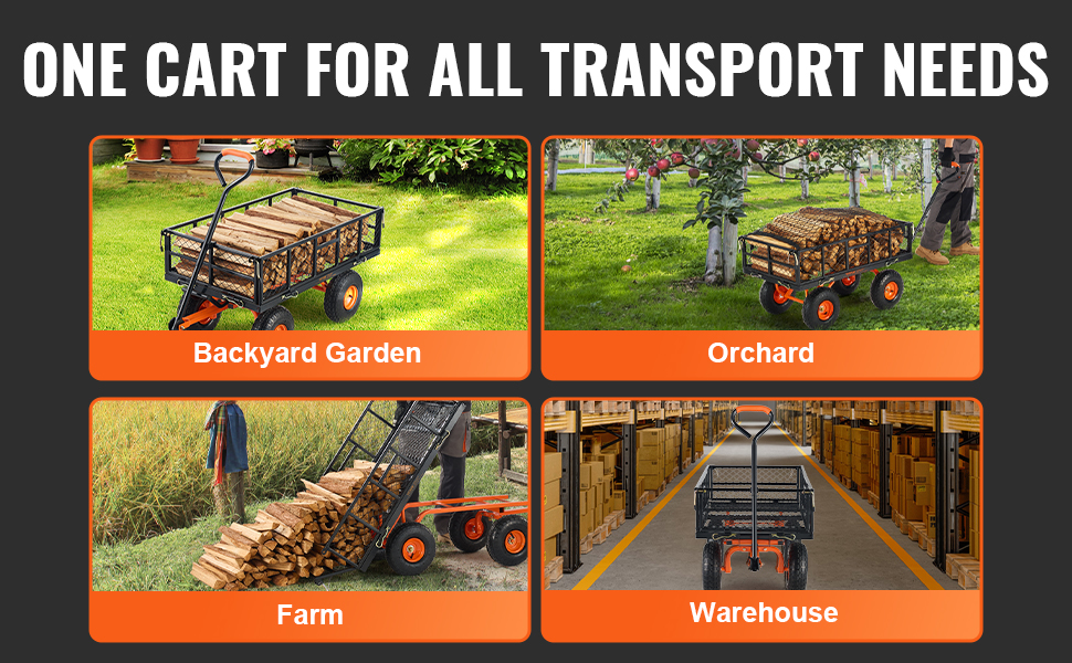 - Safe Transport: The included mesh cover and cushion ensure item safety. This yard dump cart is suitable for various settings, including gardens, orchards, and farms, as well as warehouses, efficiently completing transport tasks.