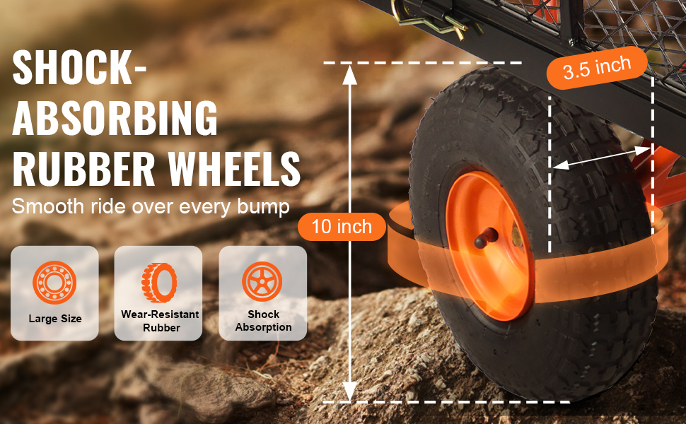- Large Tire Size: Equipped with ø255mm/10" rubber tires, this yard cart delivers superior shock absorption for navigating uneven garden terrain or grassy slopes, ensuring seamless material transport.