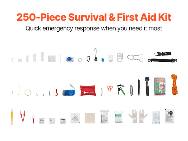 - 250-Piece Professional Survival Kit: This comprehensive kit includes essential first aid items such as bandages, gauze, and alcohol pads, alongside emergency survival tools including a first aid blanket, multi-tool knife, and flashlight. Complete coverage of critical medical and survival needs is ensured through this meticulously curated selection.