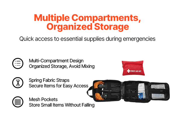 The interior of the survival first aid kit is thoughtfully designed to efficiently organize and categorize your first aid supplies. With optimally sized compartments for tools, equipment, and everyday essentials, everything is easy to find and grab quickly in an emergency.