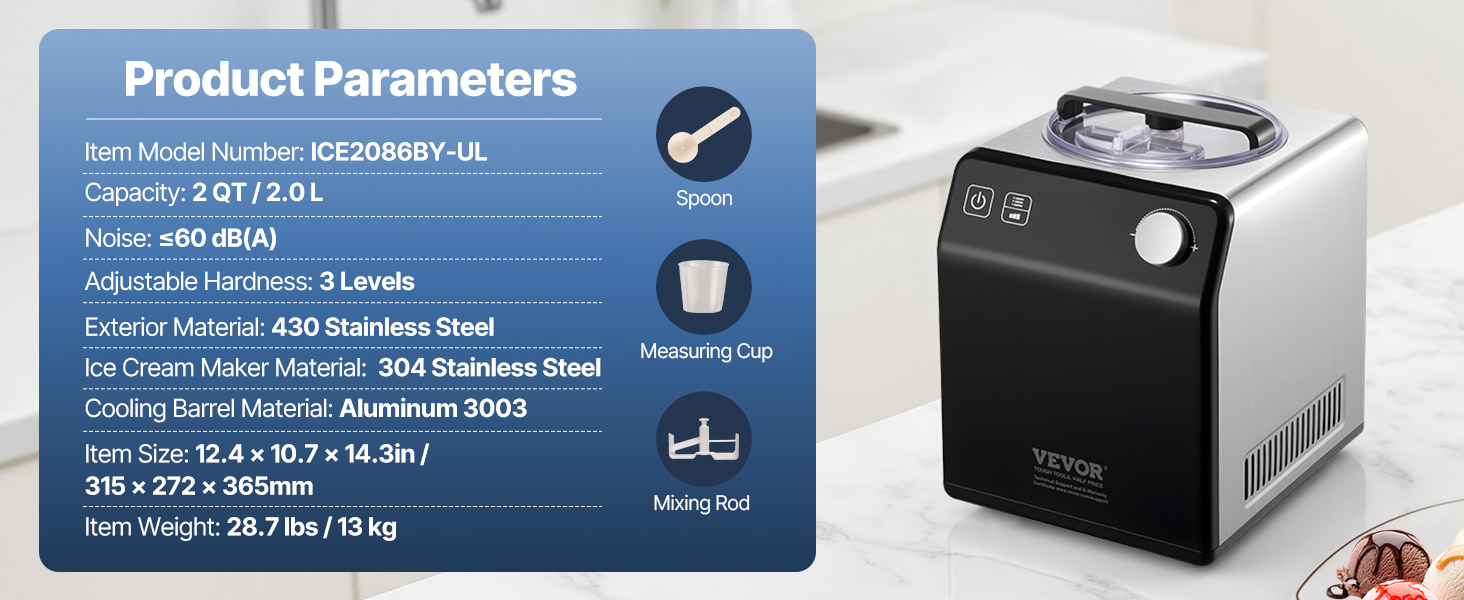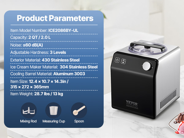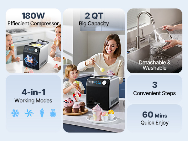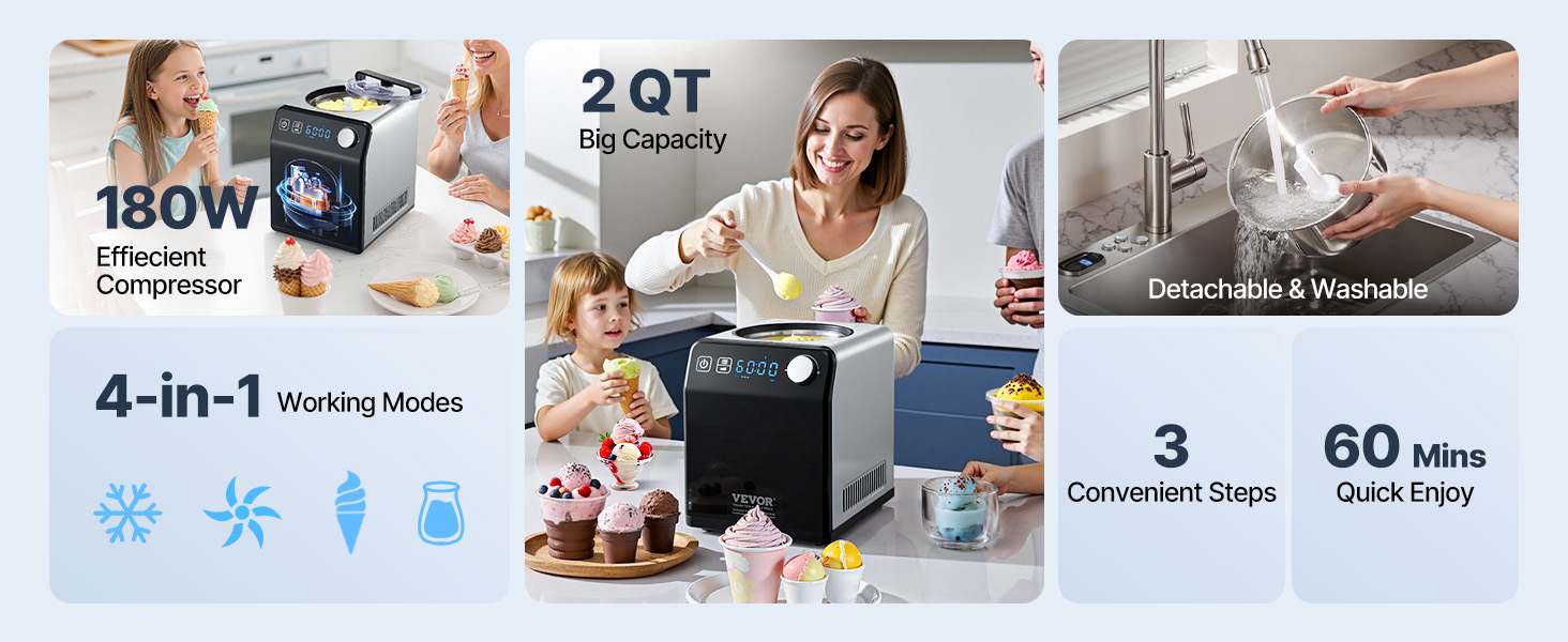 This domestic ice cream maker offers simple operation and the ability to quickly make ice cream in 1 hour. With a powerful 180W compressor and less than 60db noise level during operation, its 2QT capacity can yield approximately 15 ice cream scoops, fully catering to the needs of a large family.